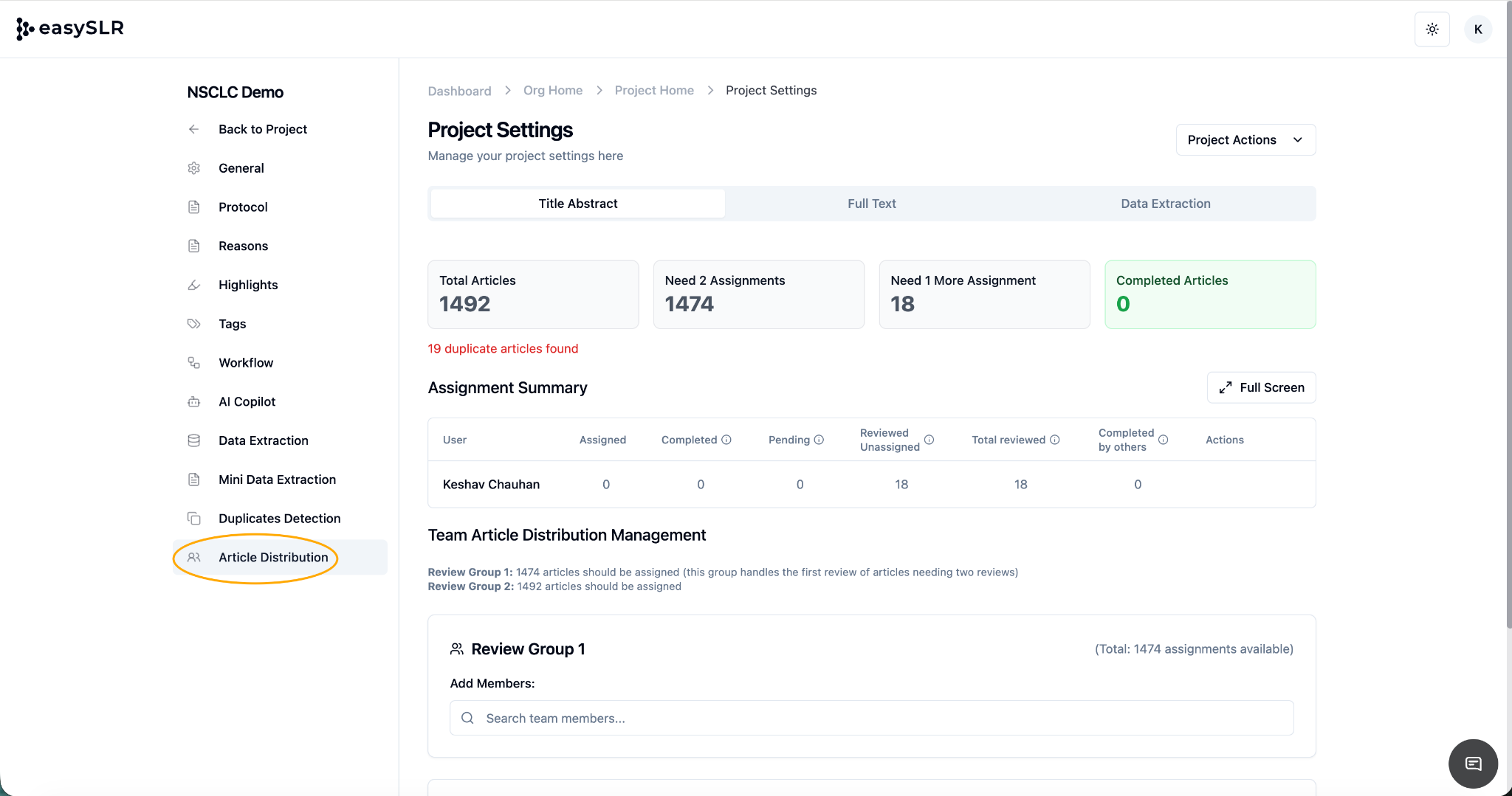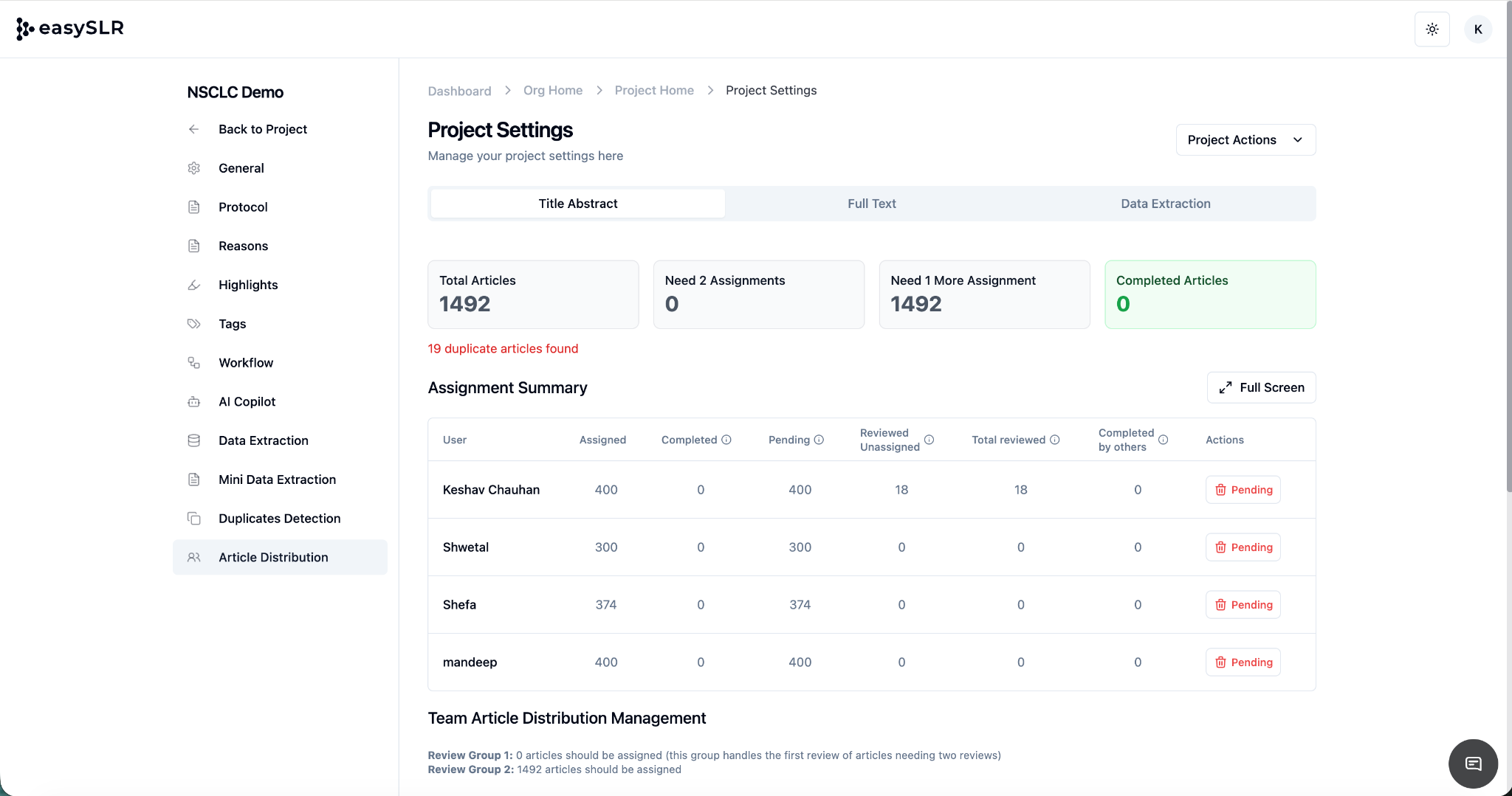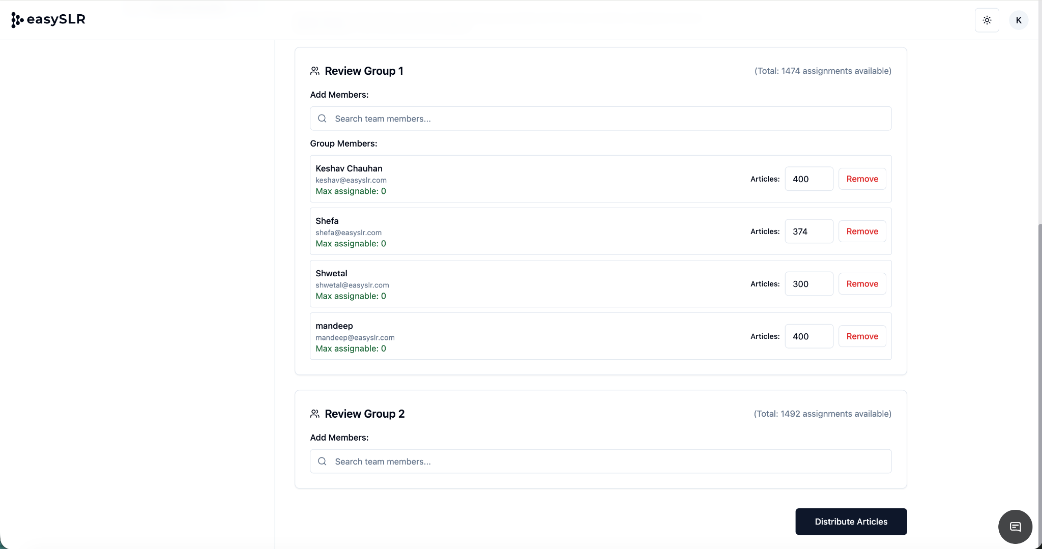 The Article Distribution feature in EasySLR helps project owners and lead reviewers to efficiently allocate screening workload among team members. Whether you’re managing a small team or a large multi-reviewer setup, this feature ensures every reviewer gets a balanced, clearly defined set of articles.
