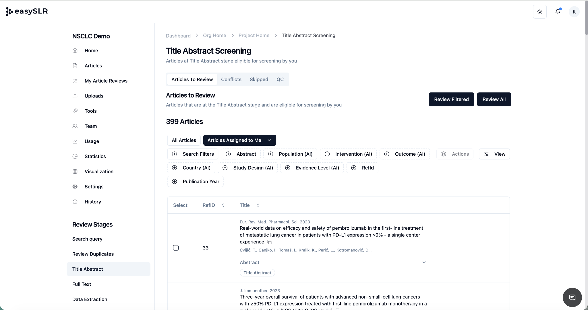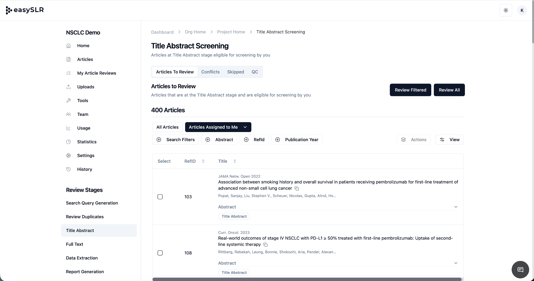 Once articles are assigned, reviewers can easily select and screen their allocated articles directly from the screening window.