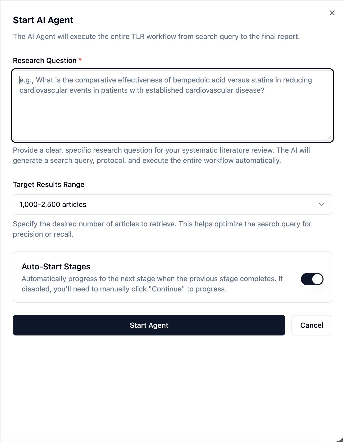 Step 3: Define your research objective and choose whether you want to progress through each stage manually or let the platform automatically advance the workflow to the next step. Once configured click on Start Agent.