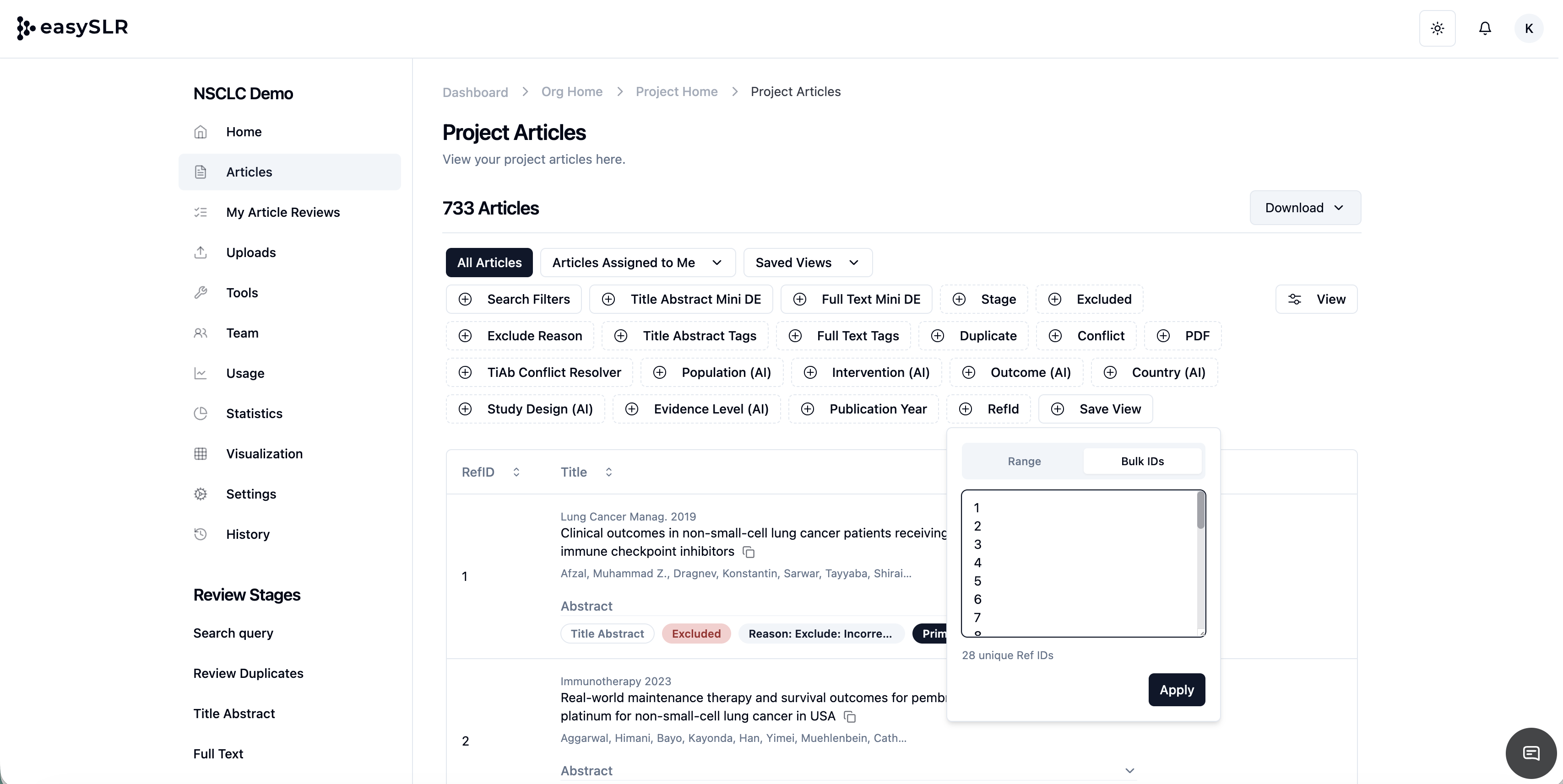 The Bulk Include/Exclude feature in EasySLR allows users to quickly select multiple articles and mark them as Included or Excluded in a single action. This significantly reduces the time spent on screening large datasets and improves workflow ...