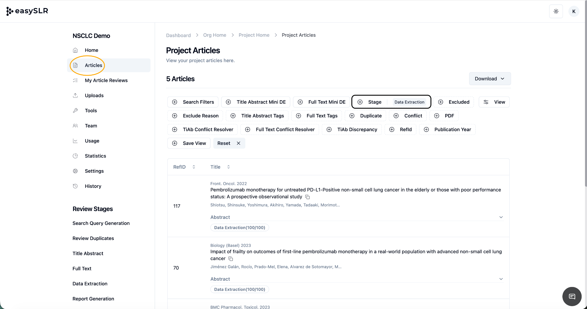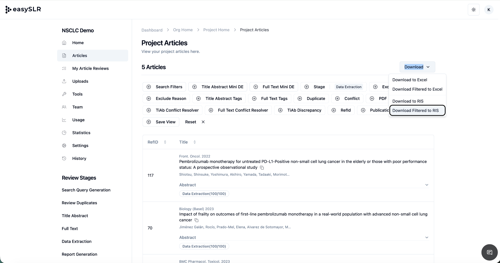 EasySLR allows you to download the final included studies in Excel or RIS files depending on your needs.