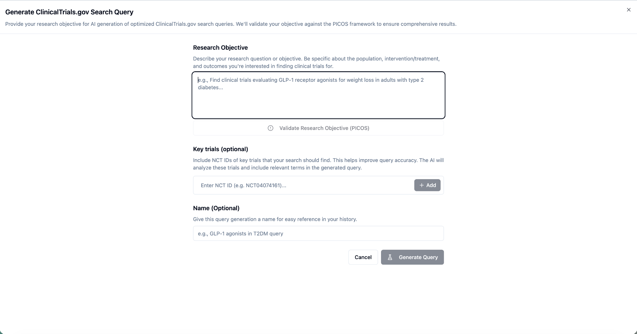 The ClinicalTrials.gov Query Generation tool in EasySLR helps you create a structured, ready-to-use search strategy for clinical trial registries in just a few steps. By leveraging AI and the PICOS framework, the tool saves time, improves consistency, and ensures your clinical trials search is aligned with your research objective.
