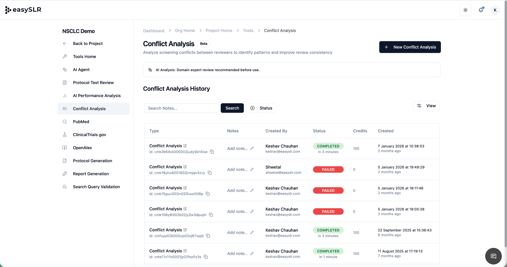 The Conflict Analysis feature in EasySLR helps identify patterns in reviewer disagreements during the screening process. It provides data-driven suggestions to refine your protocol and improve consistency across decisions, ultimately reducing conflicts.