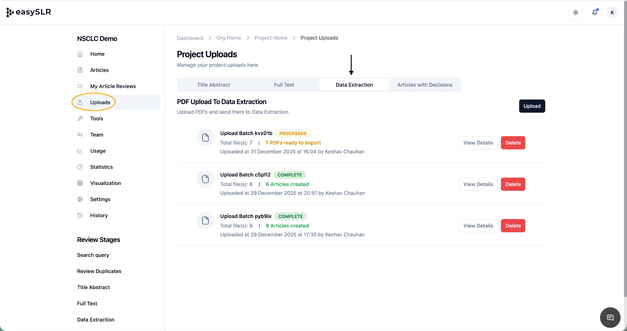 Uploaded articles appear directly in the Data Extraction stage, ready for extraction