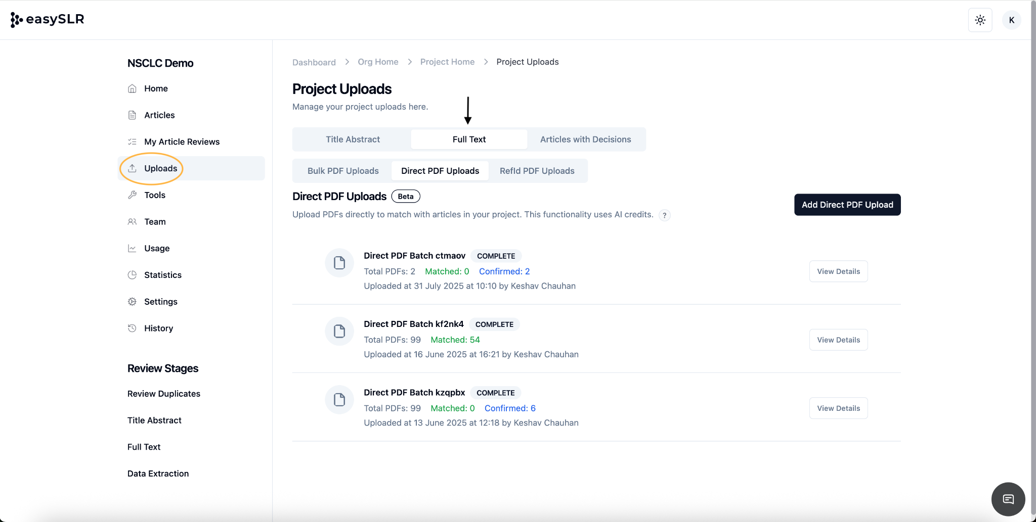 Step 1: Go to your project and click on: Uploads > Full Text> Direct PDF Uploads