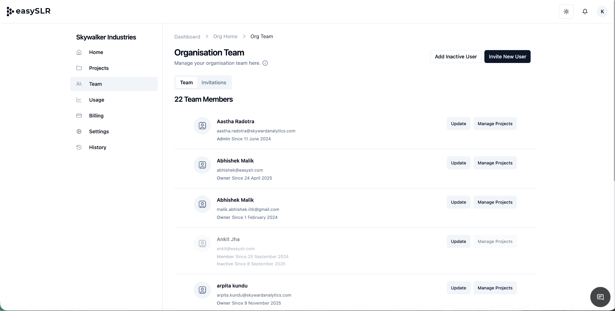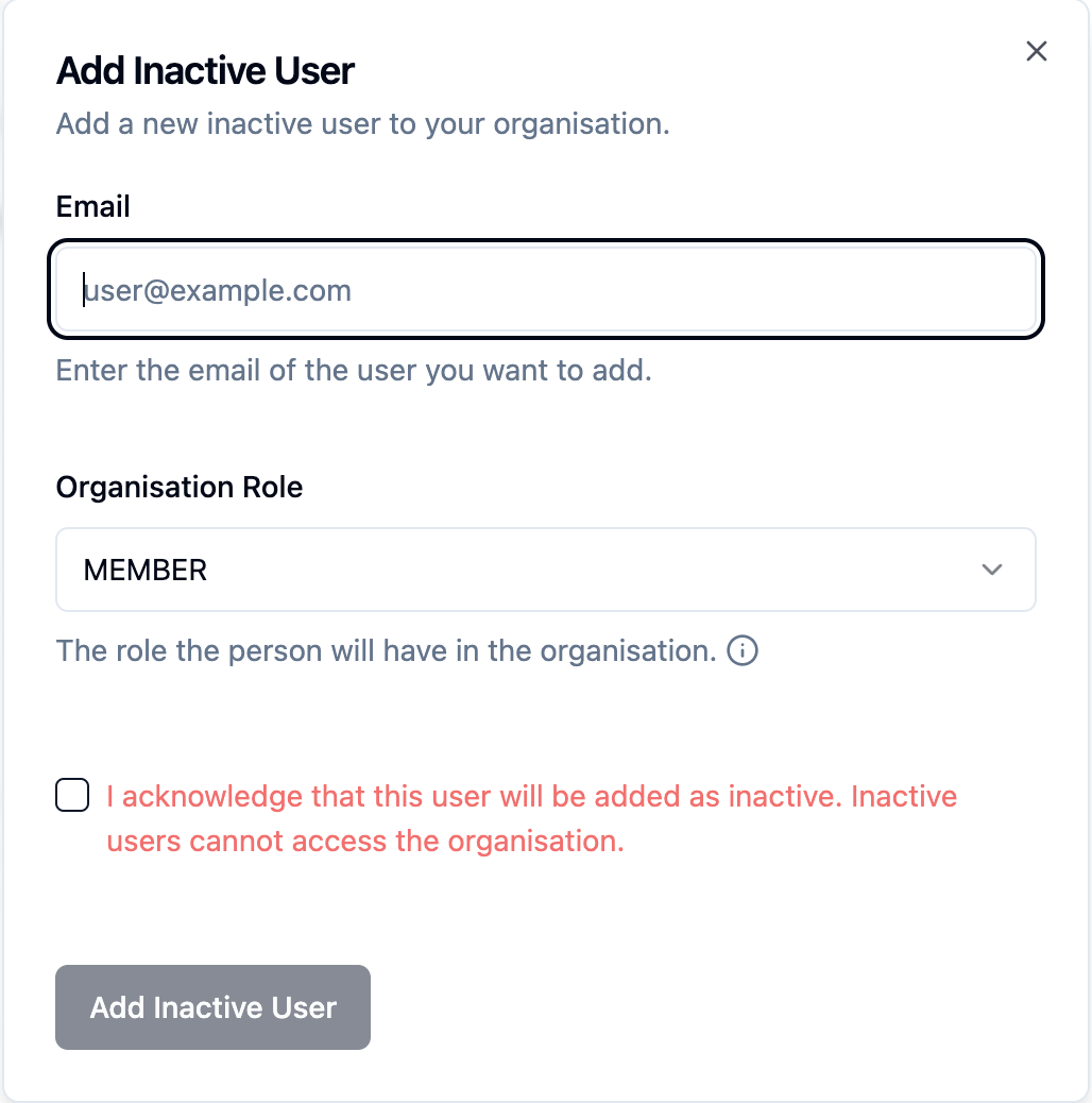 4. Team members who are no longer part of the organisation can be marked as "Inactive." Once marked inactive, they will no longer have access to the organisation or its projects, and they will also not be billed.