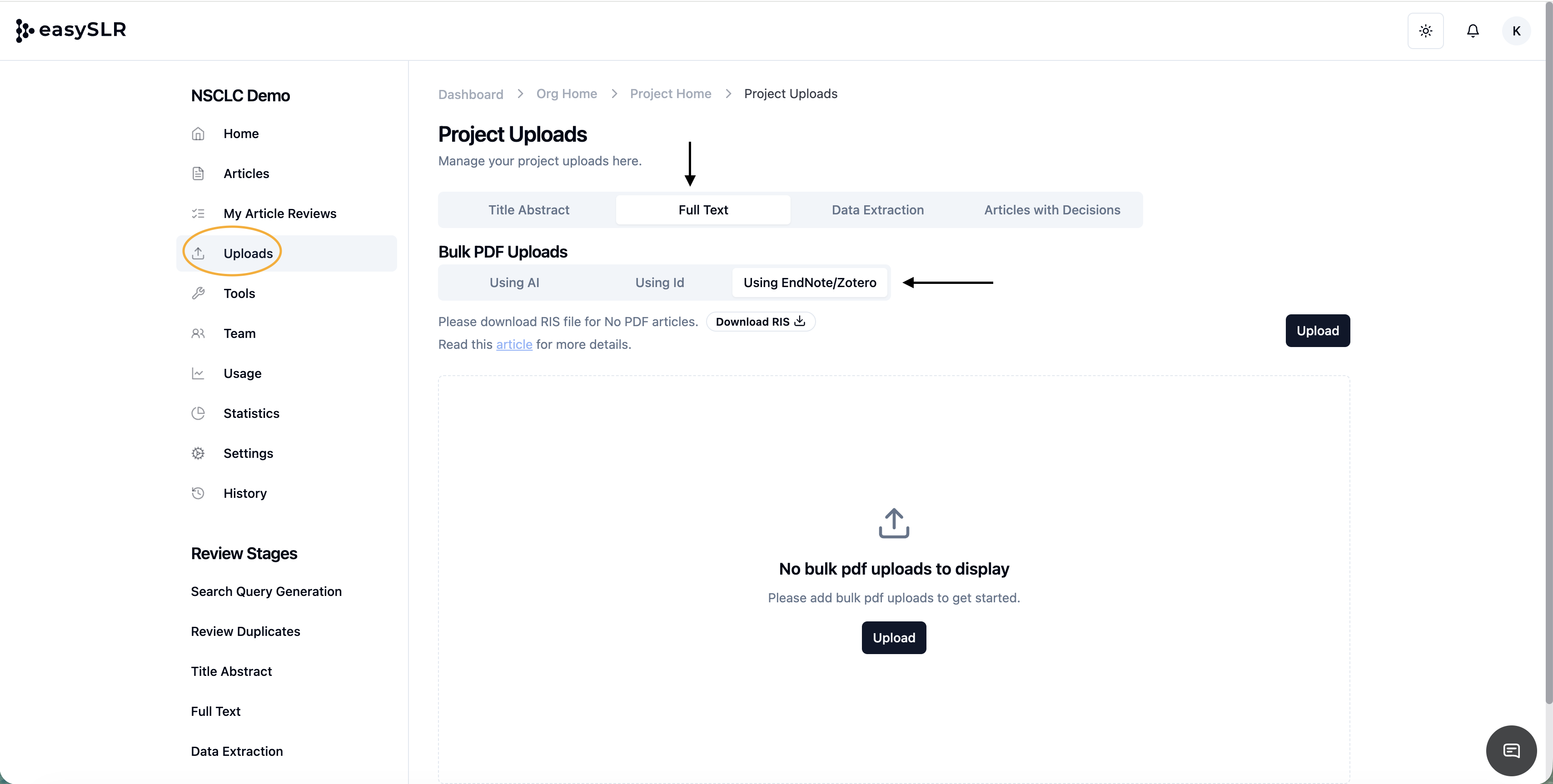EasySLR allows you to start Data Extraction directly by uploading PDFs, without first completing Title–Abstract or Full-Text screening. This feature is designed for teams that already have finalised studies or want to begin extraction immediately, ...