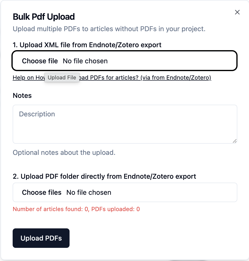 Uploading: Import the citations back into EasySLR by uploading the EndNote/Zotero XML file and its corresponding 'PDF' folder. There is no need to rename or reorganise files.
