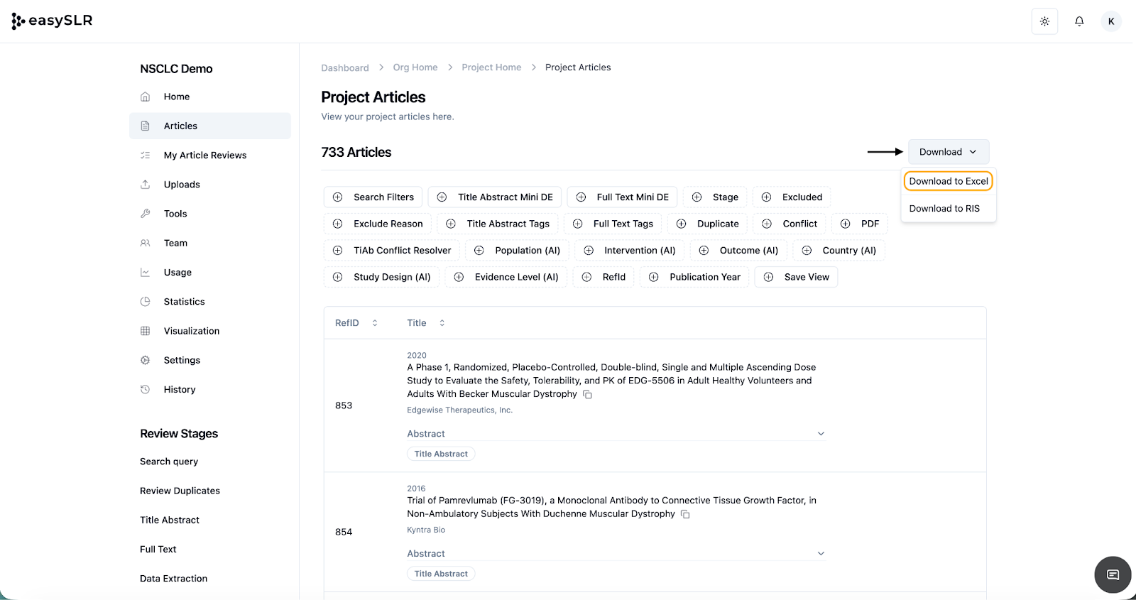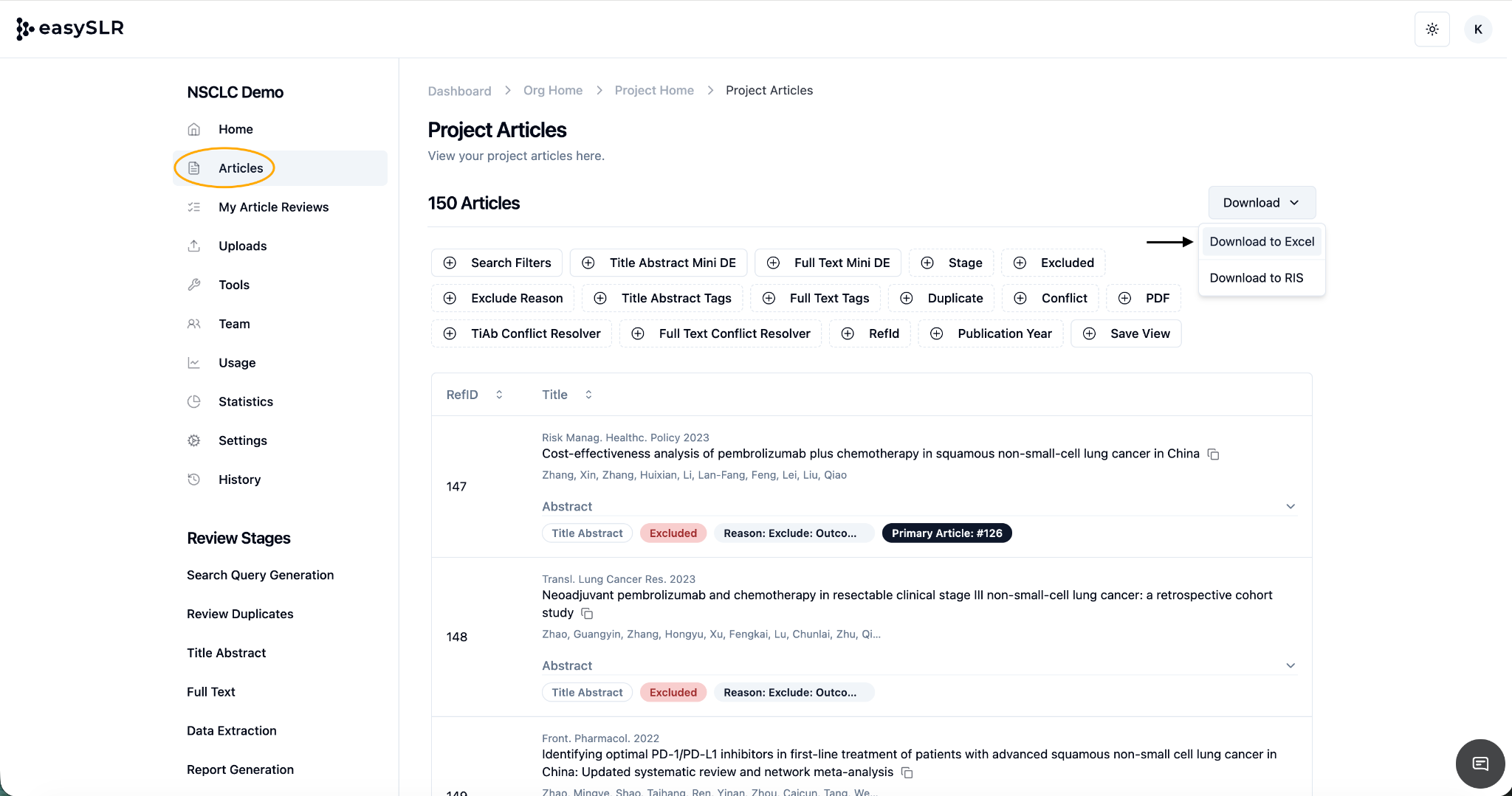 You can use various filters to narrow down the specific articles you want to download. After the download is complete, you can review the file to see the AI decisions and compare them with the decisions made by the reviewers. The AI decisions are added in a separate column within the Excel sheet, making it easy for you to understand and Analyse them alongside the reviewer's decisions.