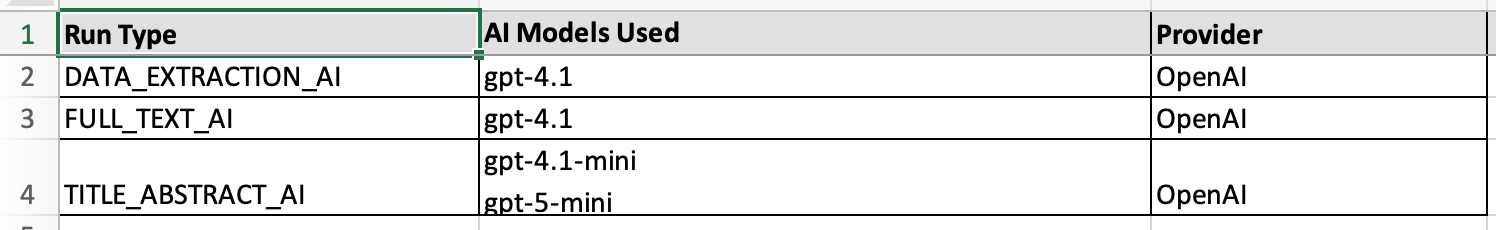 This export helps teams clearly understand which AI models were used, where they were applied, and for what purpose within the review lifecycle.