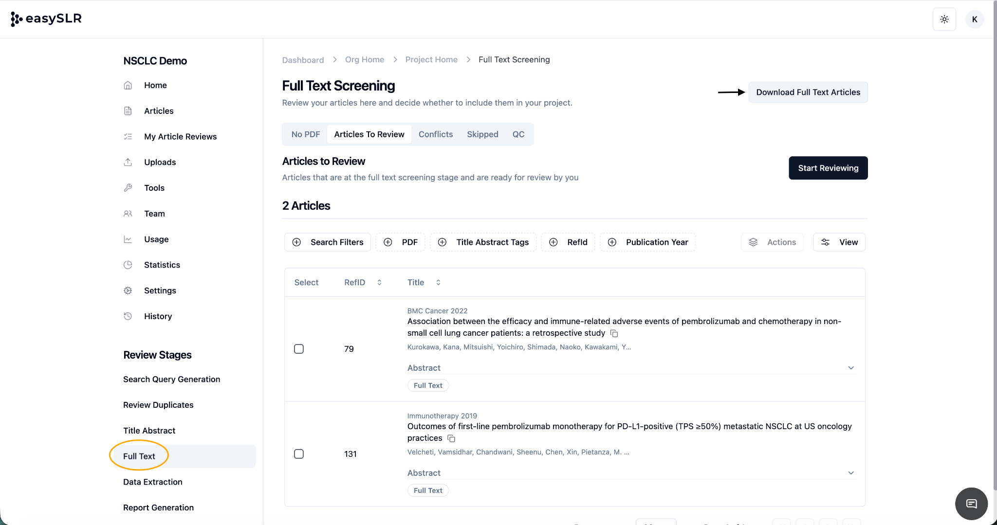 EasySLR is designed to streamline the screening process by automatically retrieving full-text PDFs as studies transition from the Title and Abstract Screening stage to the Full Text Screening stage. This automation is based on the availability of a ...