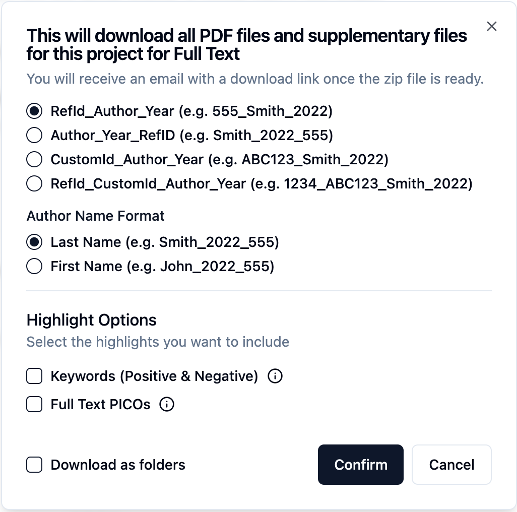 Note: When you click on the download option, a pop-up box will appear, allowing you to select the fields you want to include in the PDF file name before downloading. The selected fields will be used to name the individual PDF files within the ZIP file. You can also choose to download PDFs with AI-extracted PICOS, including highlighted keywords and sources.
