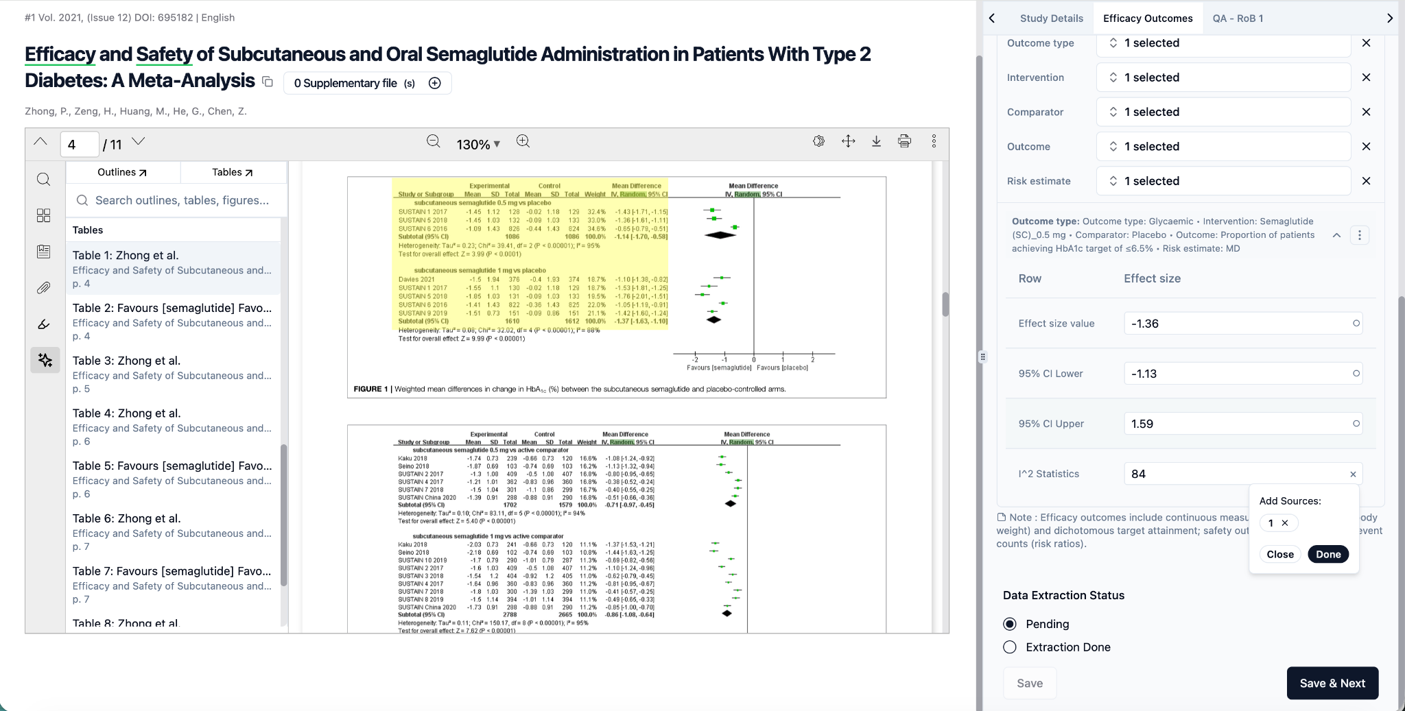 Yes—EasySLR can extract data from tables and figures within the main full-text PDF. The AI processes the entire document, capturing structured information from tables as well as key results described in figure captions and related text. All extracted values are linked back to their original source for easy verification.