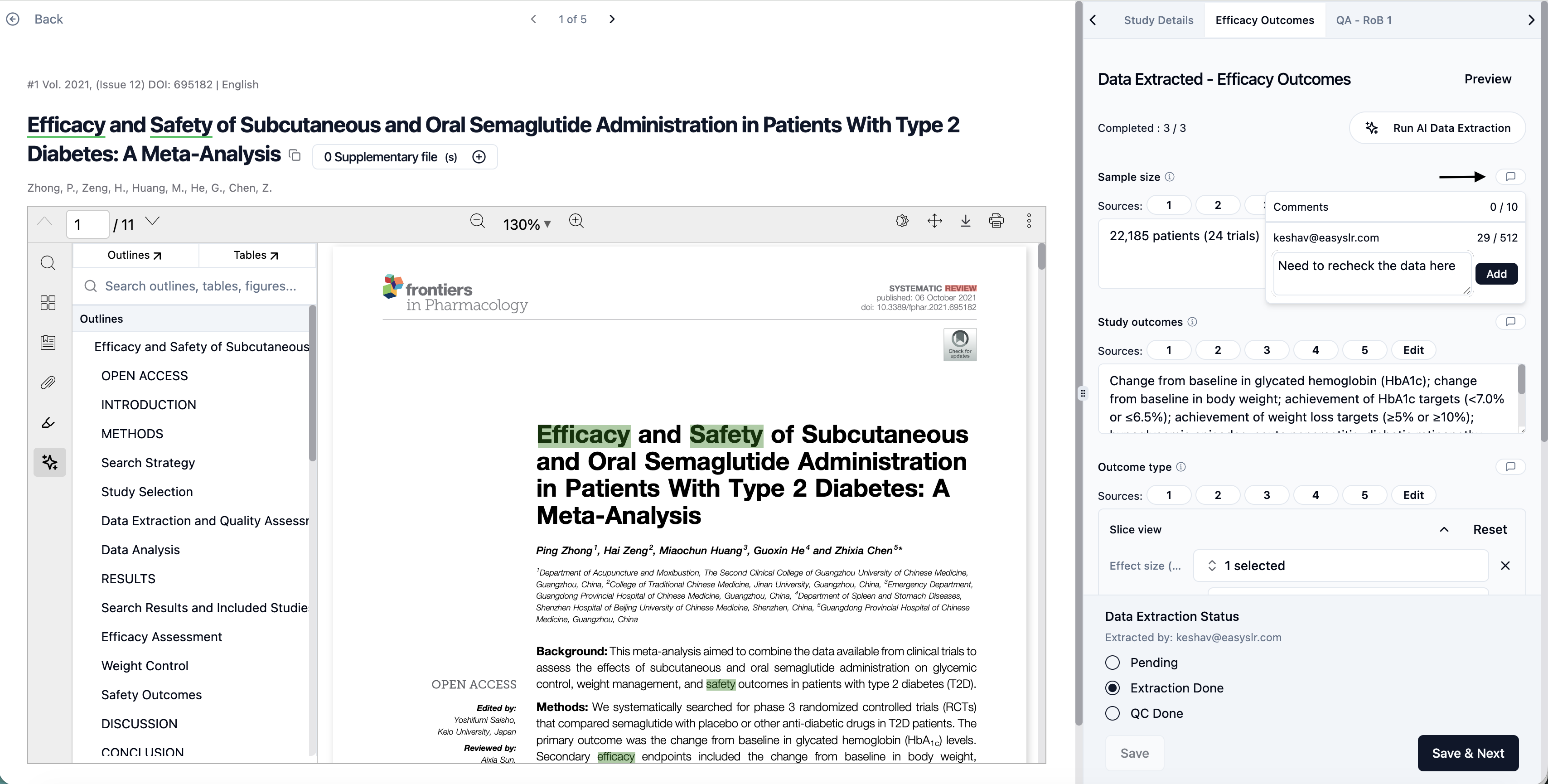 Once you've completed the extraction and made necessary updates, select ‘Extraction done’ available at the bottom of the screen and click ‘Save’. This action moves the article to the "Extraction Done" section, where it will be available for another reviewer to begin the Quality Control (QC) process.
