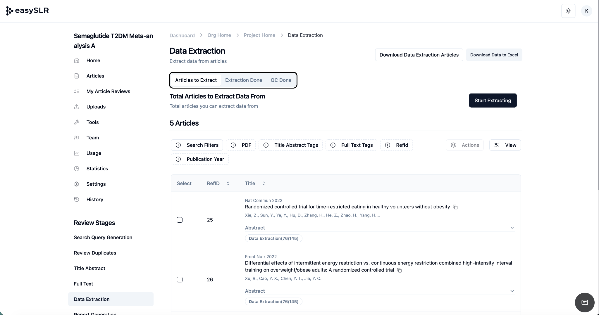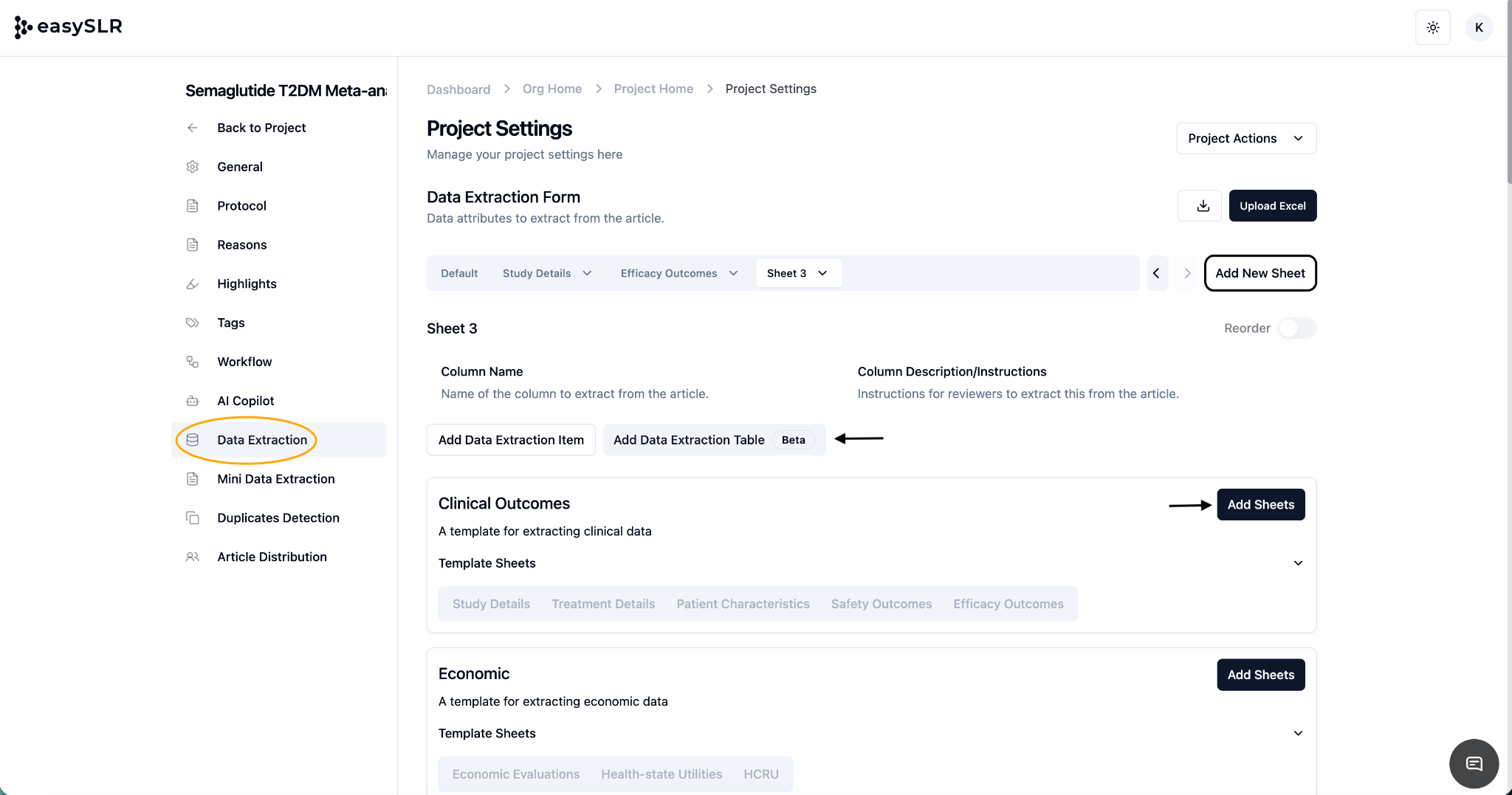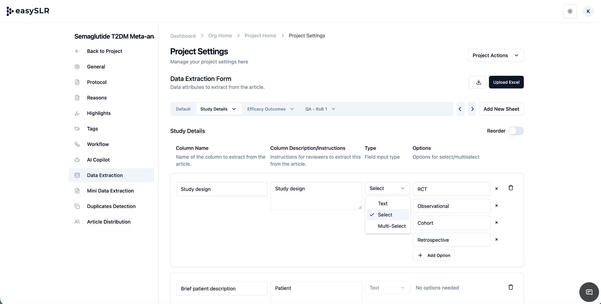 Setting up Data Extraction in EasySLR is simple and straightforward . You can choose to set up data extraction while setting up the project, or later after you finish Title abstract and Full text screening.