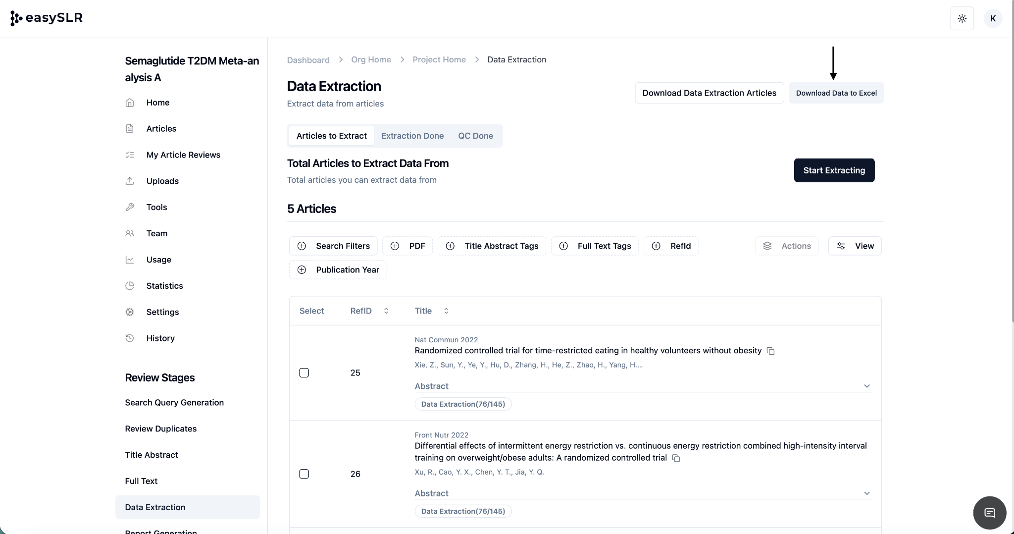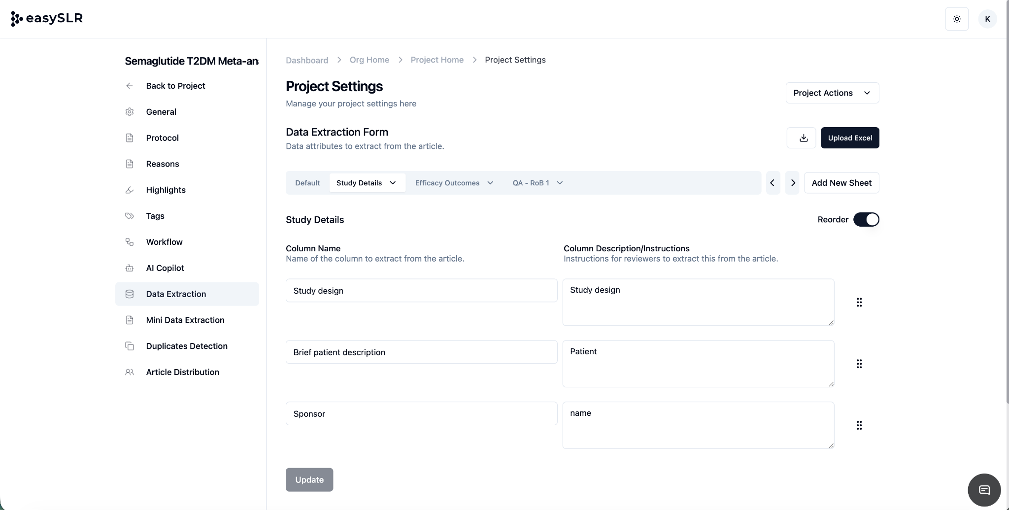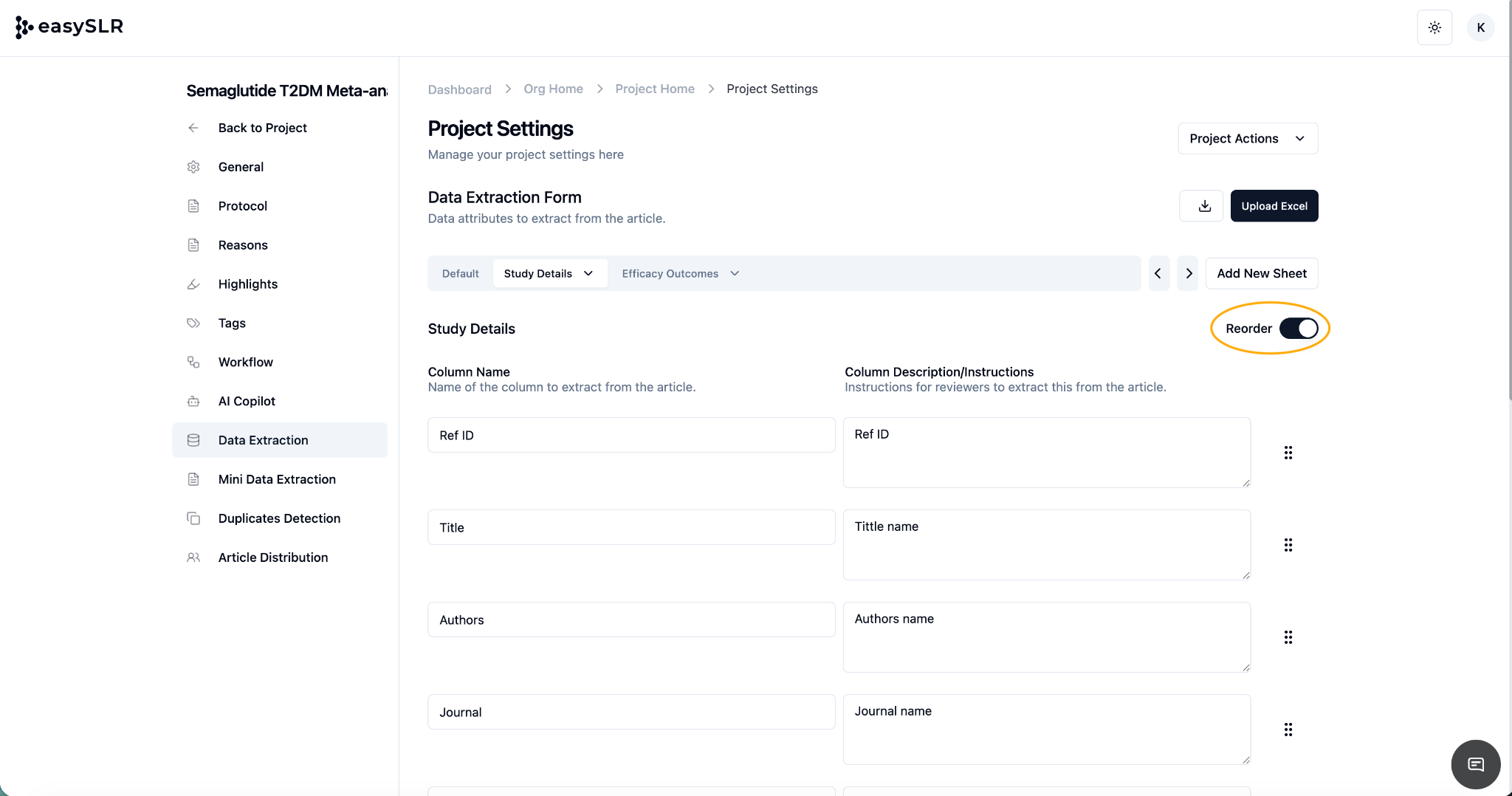 Setting up Data Extraction in EasySLR is simple and straightforward . You can choose to set up data extraction while setting up the project, or later after you finish Title abstract and Full text screening.