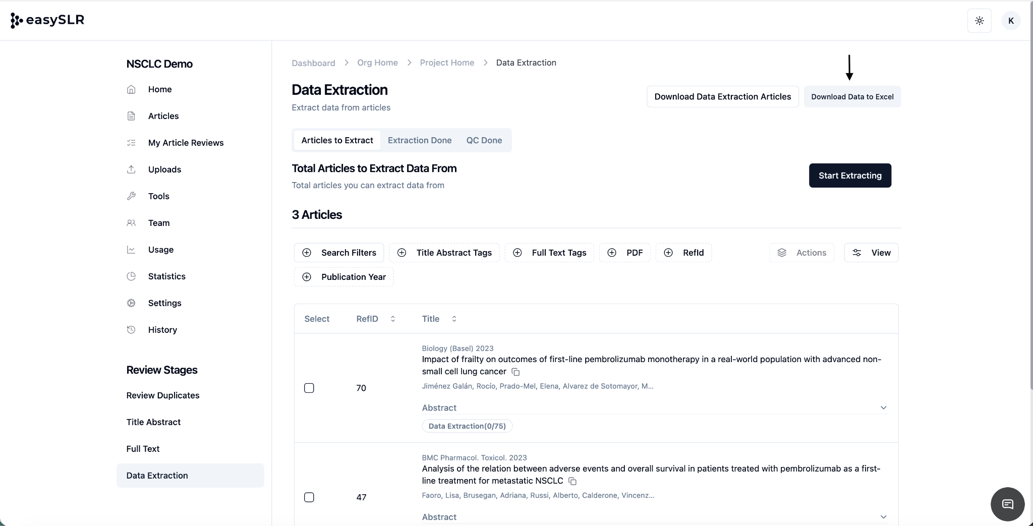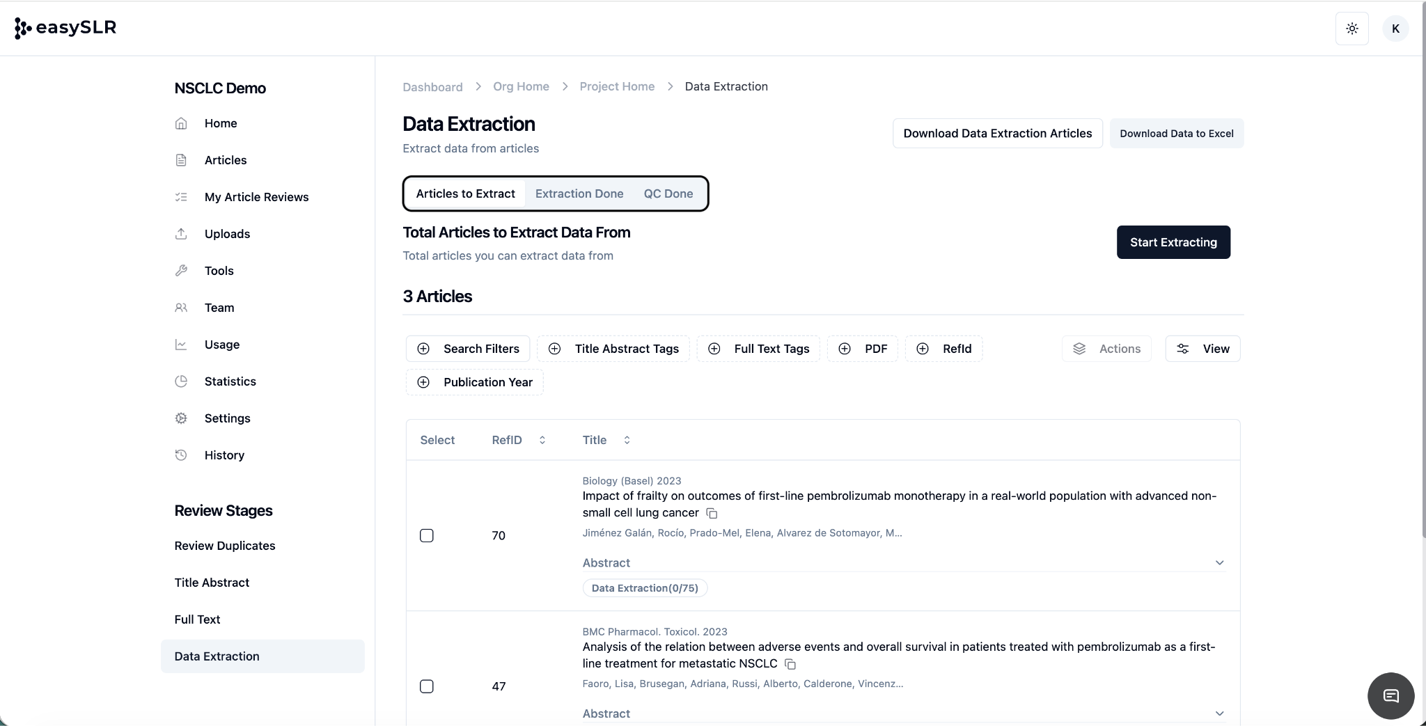 Data Extraction is divided into three sections to categorise studies based on their extraction stage. Initially, all articles will be categorised as "Articles to Extract," signifying that the extraction process has not begun.