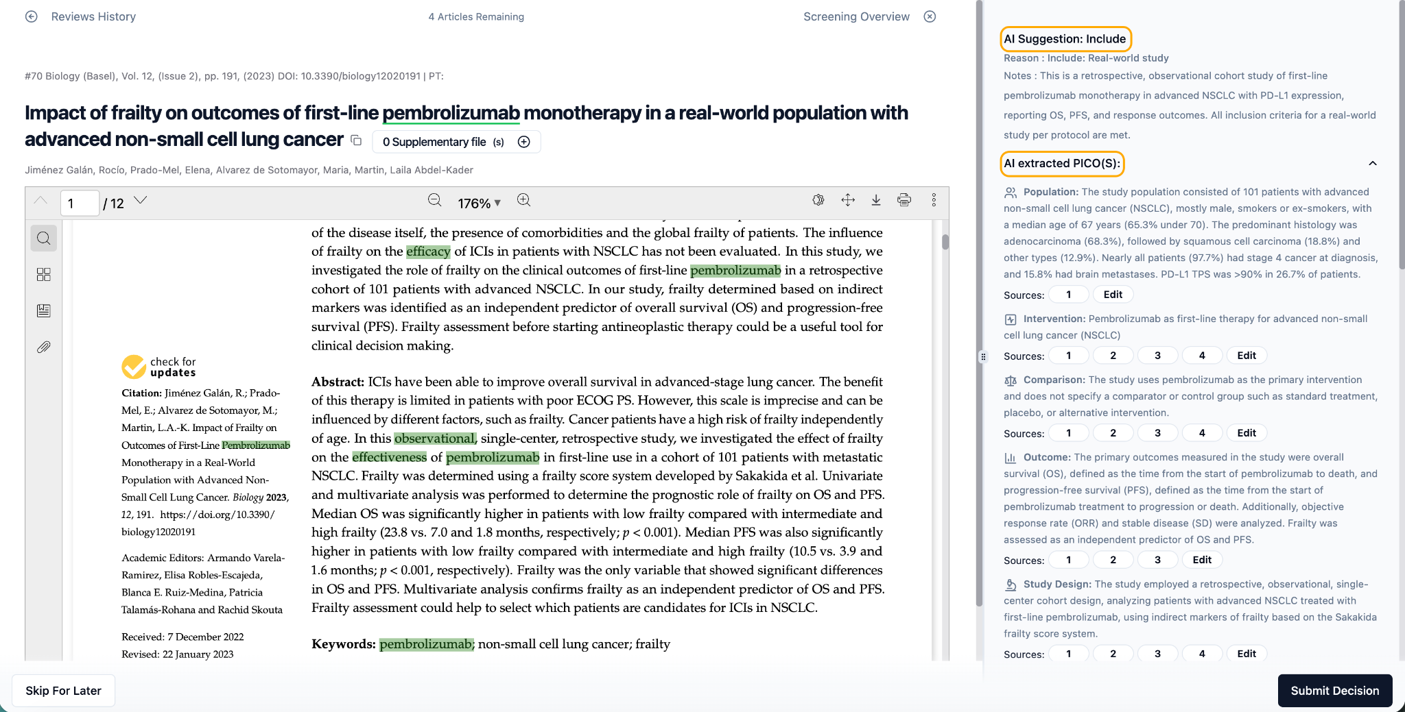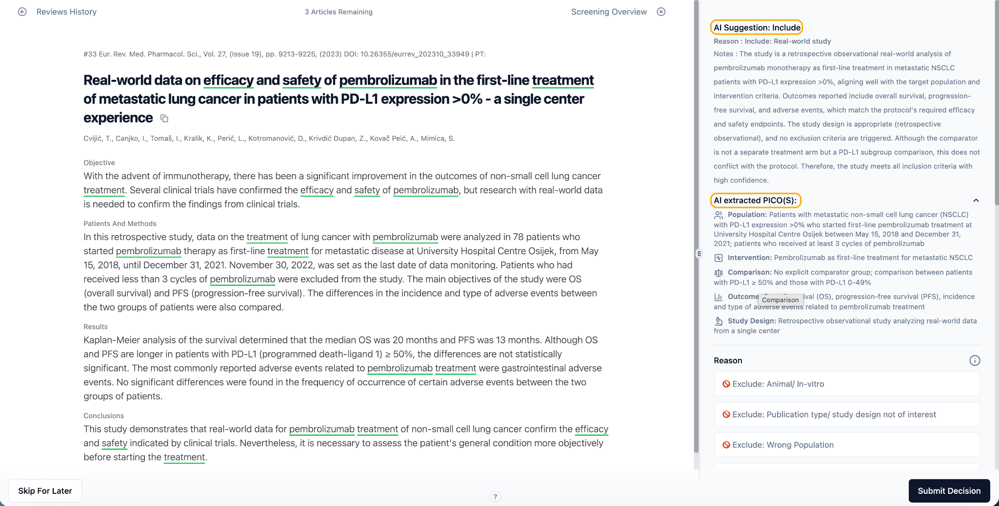 Similarly, during the Full Text screening phase, the AI examines the entire content of articles, including the full text, tables, and figures. It applies the defined criteria to assess the relevance and suitability of each article for inclusion in the project. Based on this analysis, the AI provides suggestions to users regarding the inclusion or exclusion of articles. It also links the PICOS with the relevant sources within the PDF.