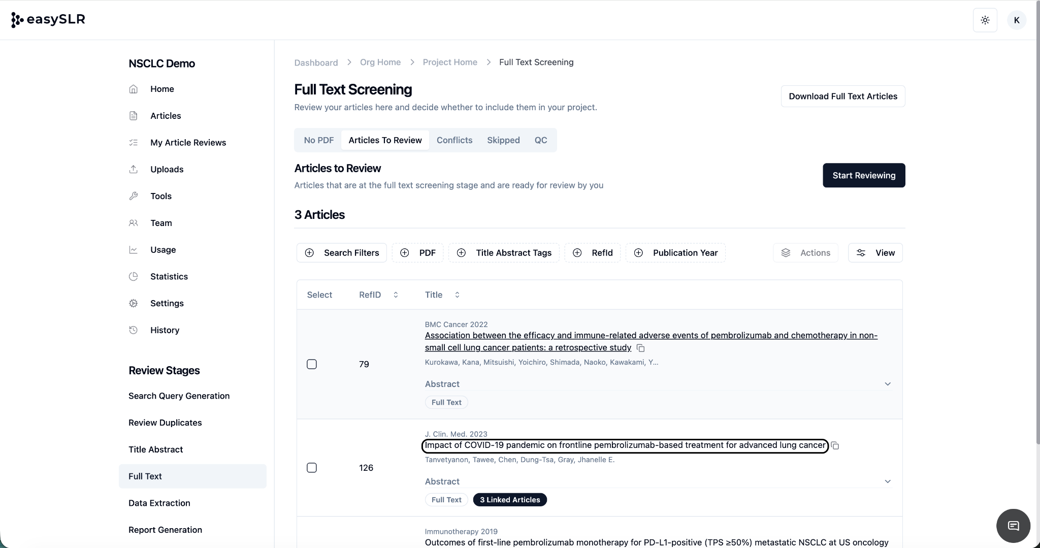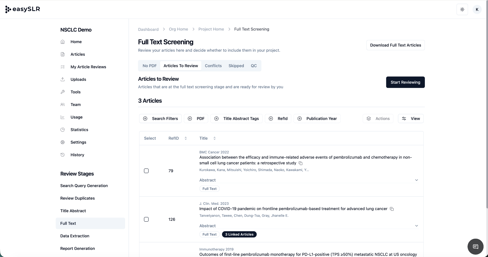 EasySLR is designed to streamline the screening process by automatically retrieving full-text PDFs as studies transition from the Title and Abstract Screening stage to the Full Text Screening stage. This automation is based on the availability of a ...