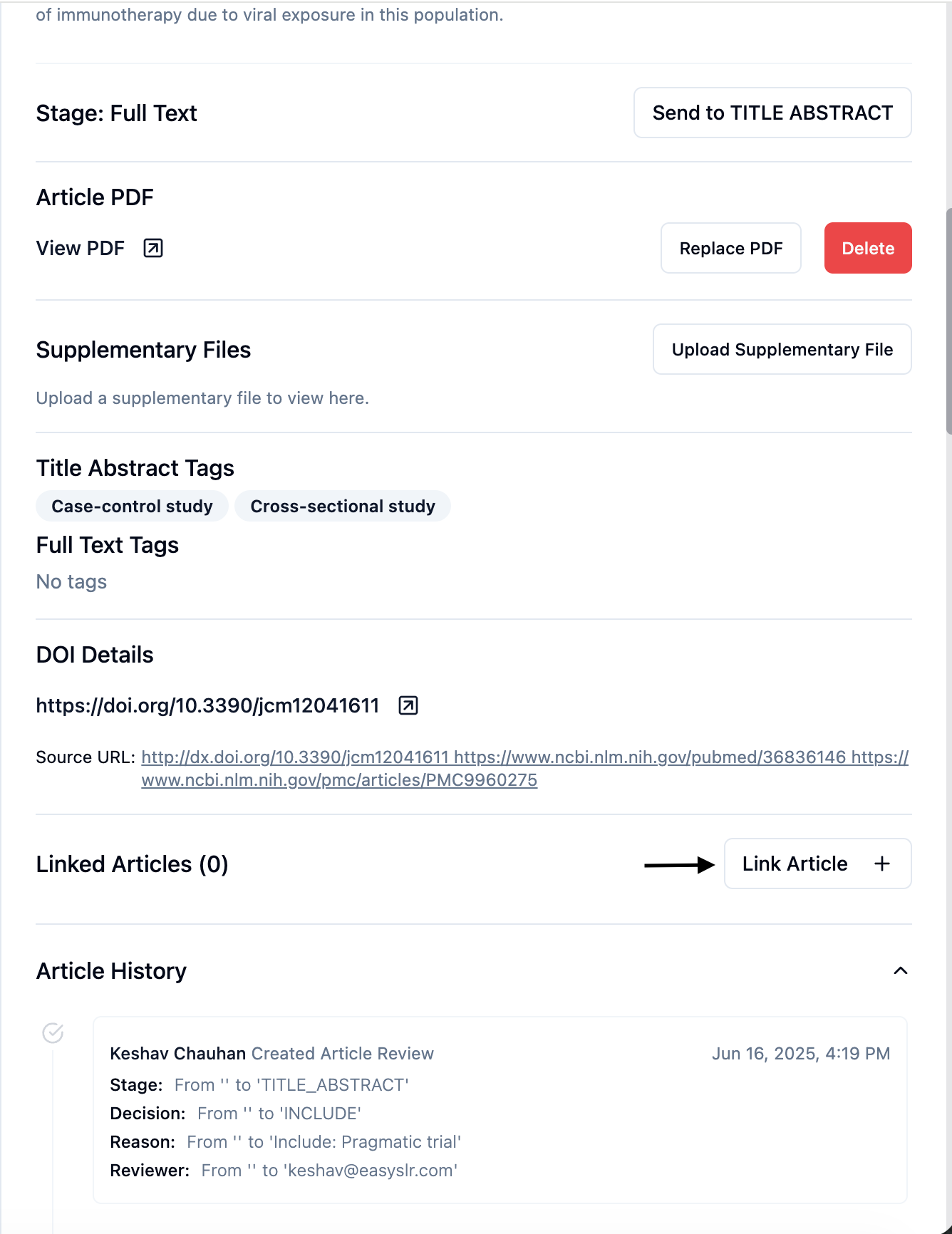 The "Linking Full-text" feature enables users to connect related studies within a project. This feature is particularly useful for systematic reviews or literature analyses where multiple studies may share a common topic, methodology, or research question.
