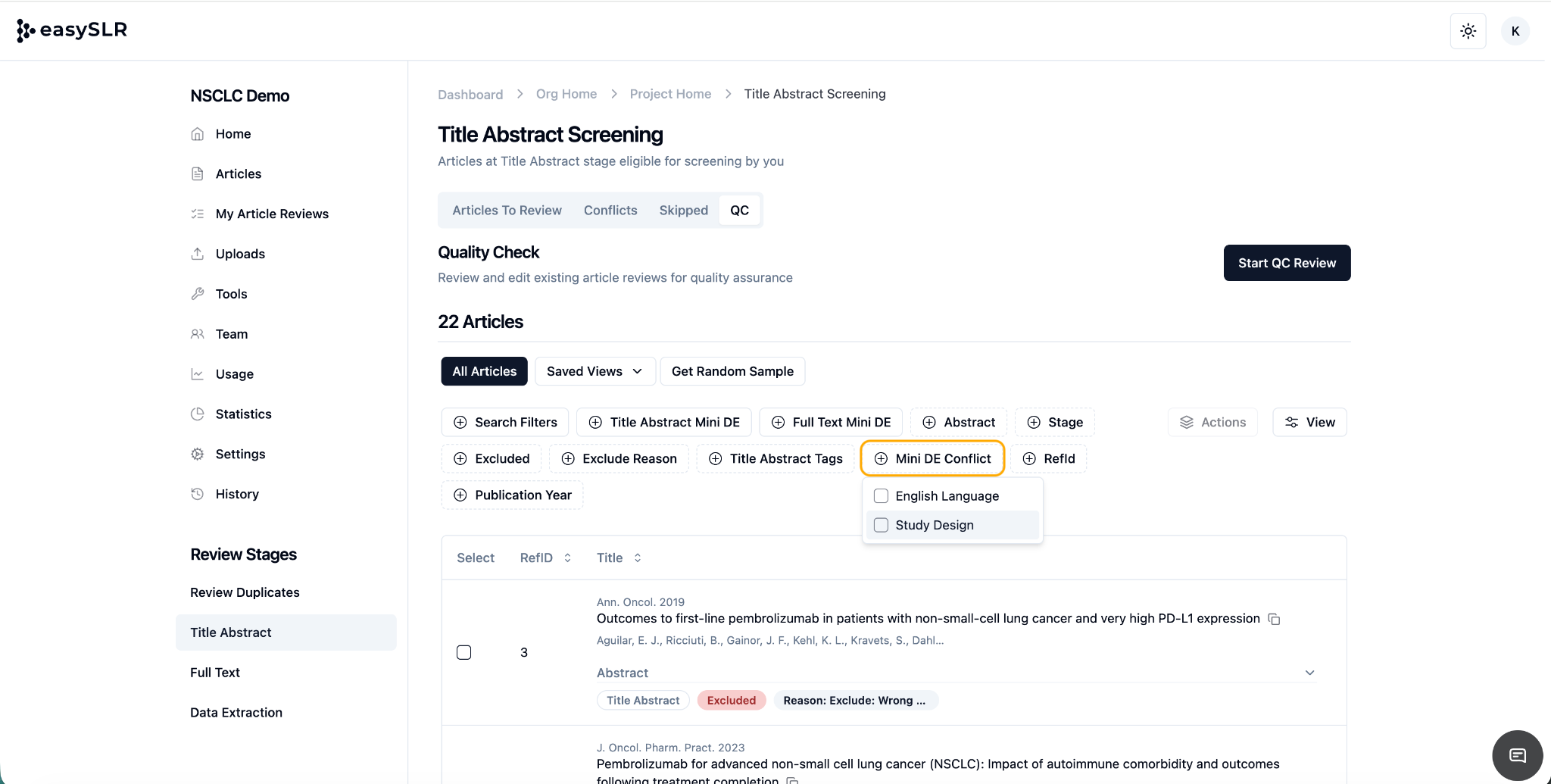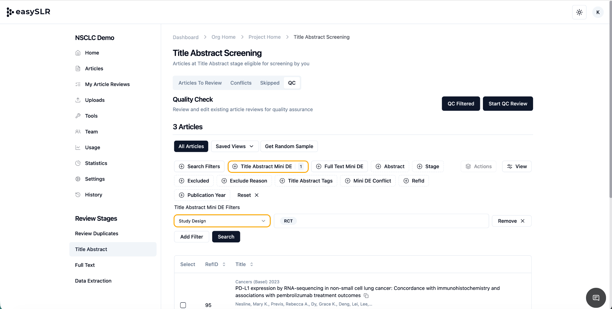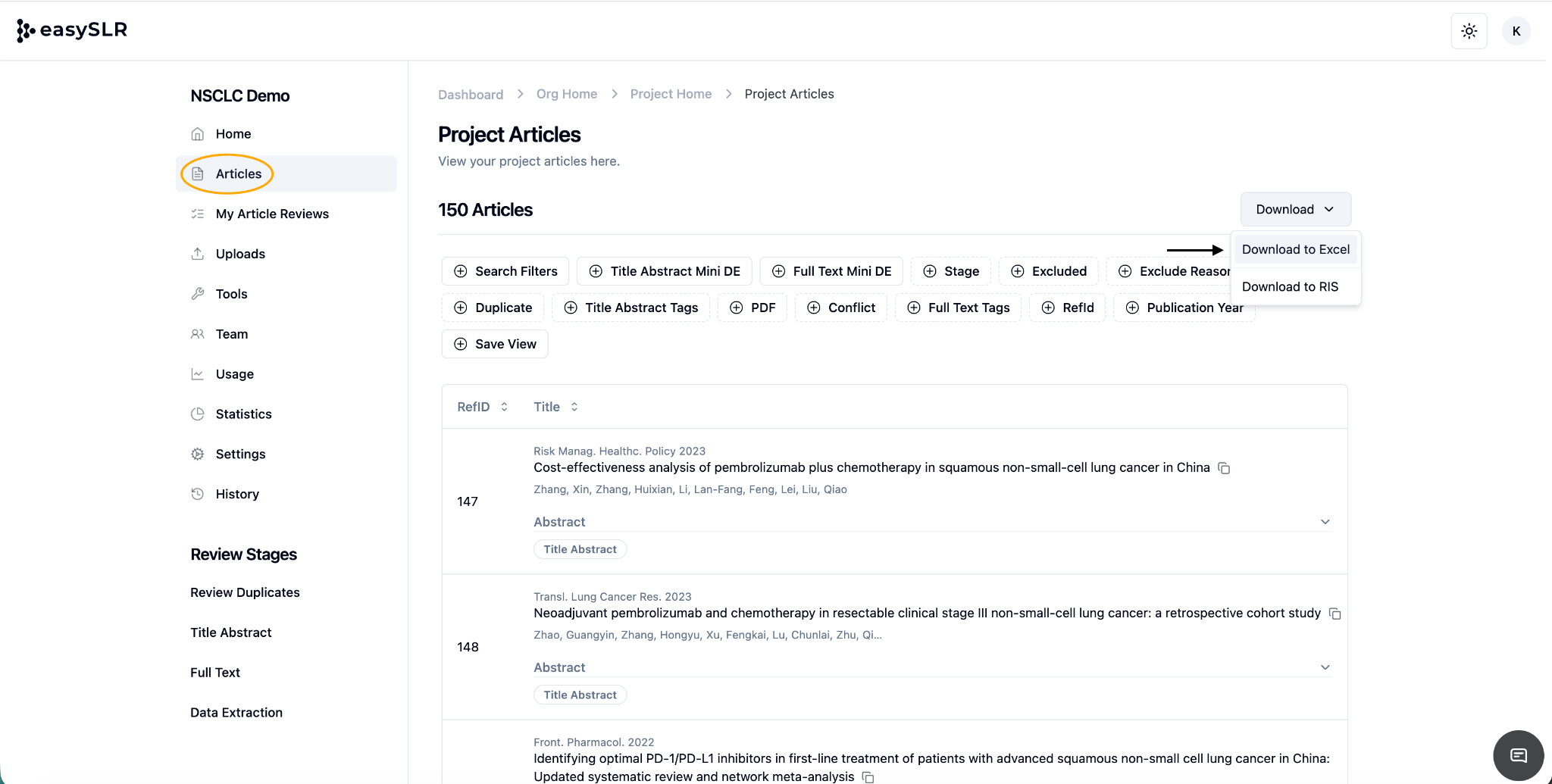 The Save View feature in EasySLR enables project leads to streamline collaboration by pre-assigning specific sets of articles to individual reviewers. Using filters such as tags, reference ID ranges, and other criteria, you can define custom views ...
