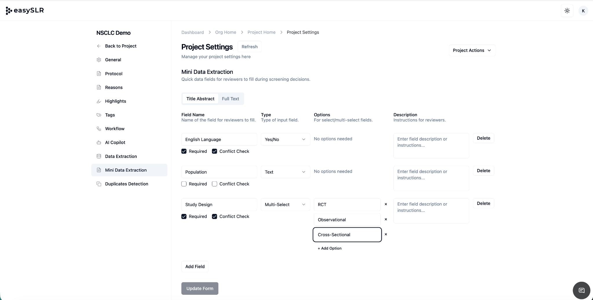 The Mini Data Extraction feature in EasySLR allows teams to extract a focused set of predefined fields during the screening process. It's ideal when only high-level or limited data is required before full-scale data extraction begins.