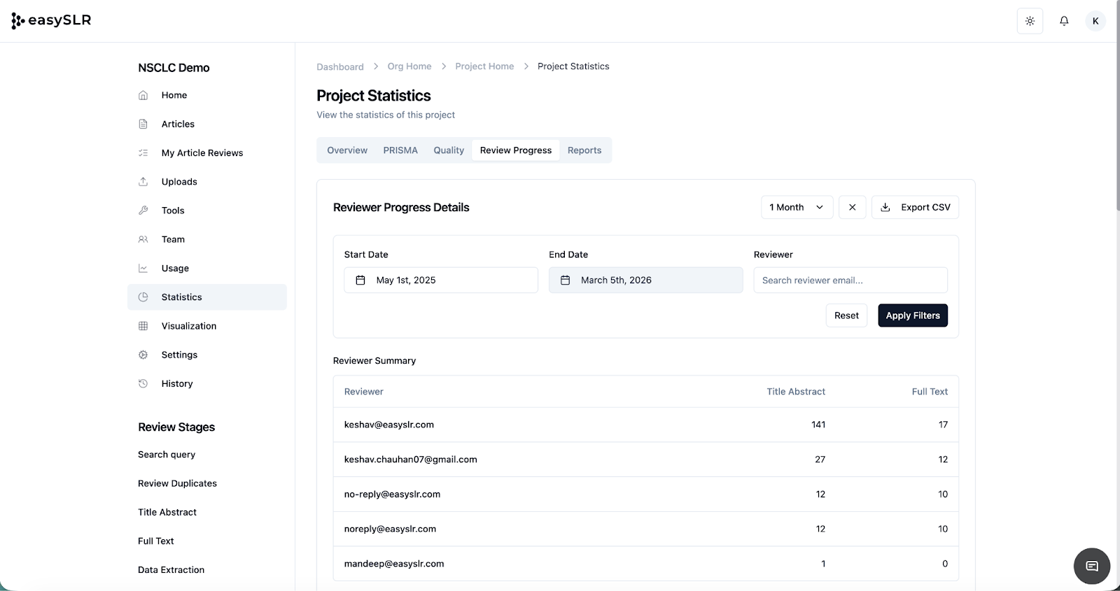 It tracks key metrics, such as reviewer consistency, decision accuracy, ensuring the integrity of your research workflow. These data points help in identifying areas for process improvement, empowering teams to maintain the highest standards for their systematic reviews.