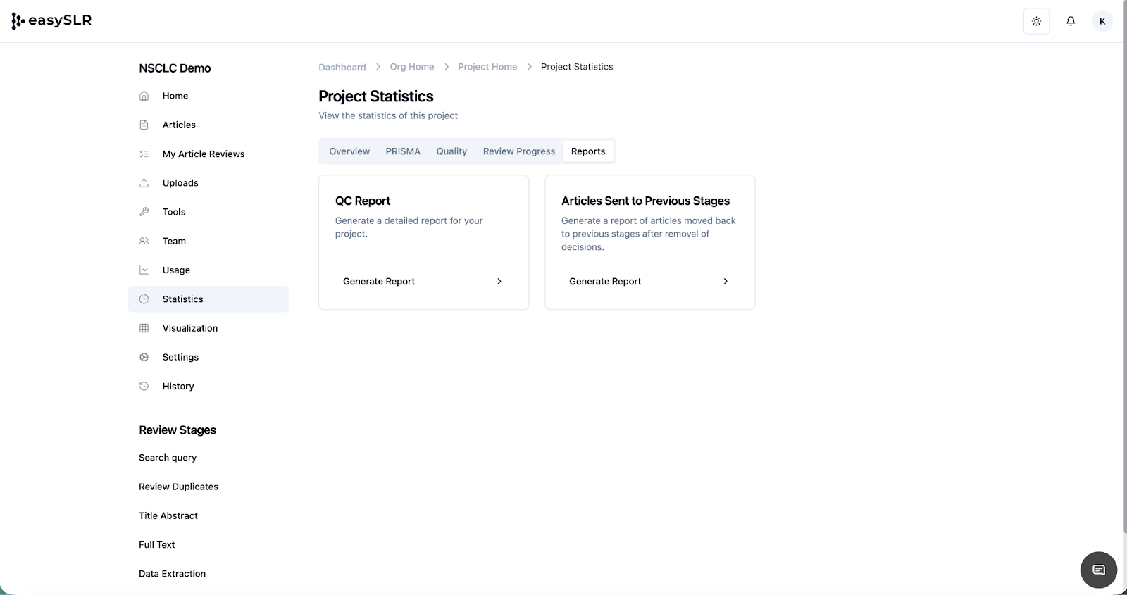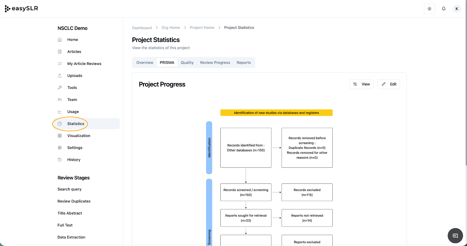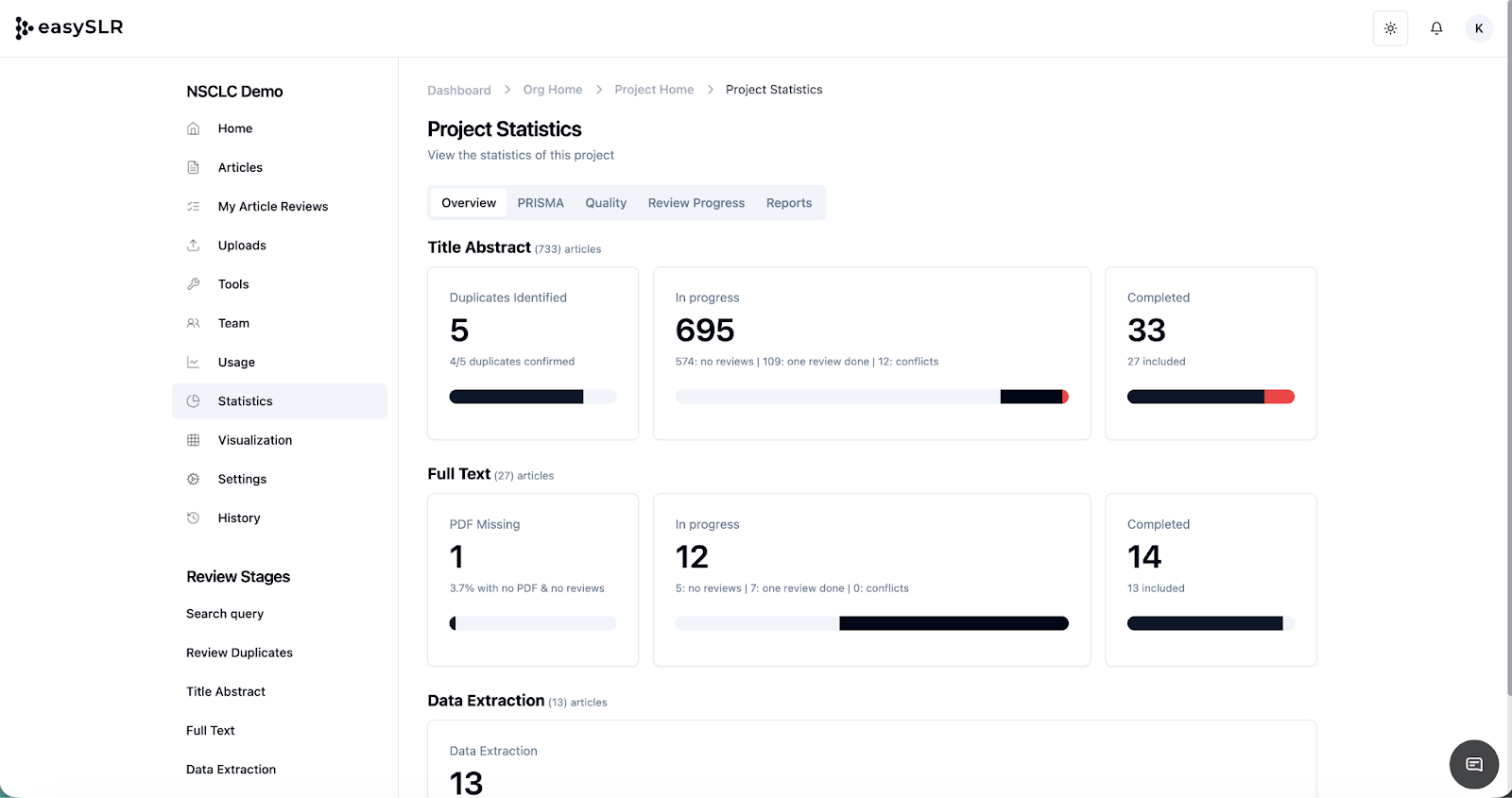 This layout is designed for clarity, breaking down progress across various screening stages. When you upload your RIS file, the system automatically captures and displays this data, allowing you to track your project's progression through each screening stage effortlessly.