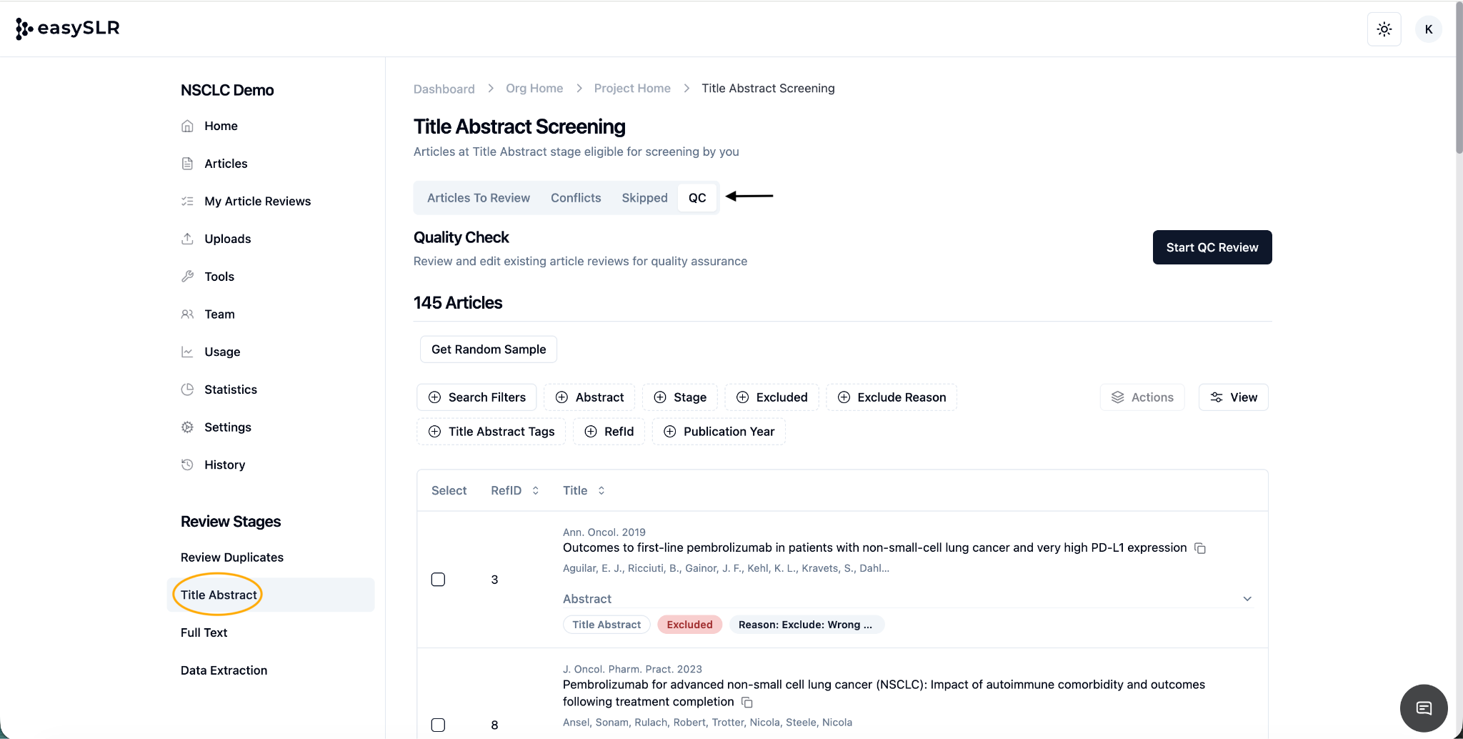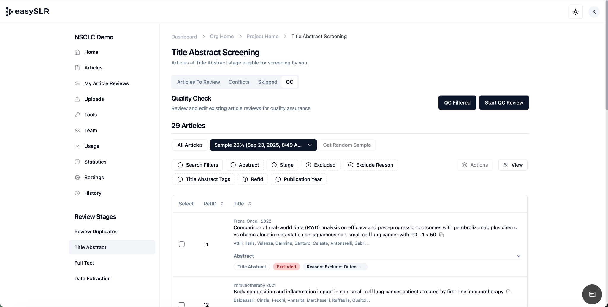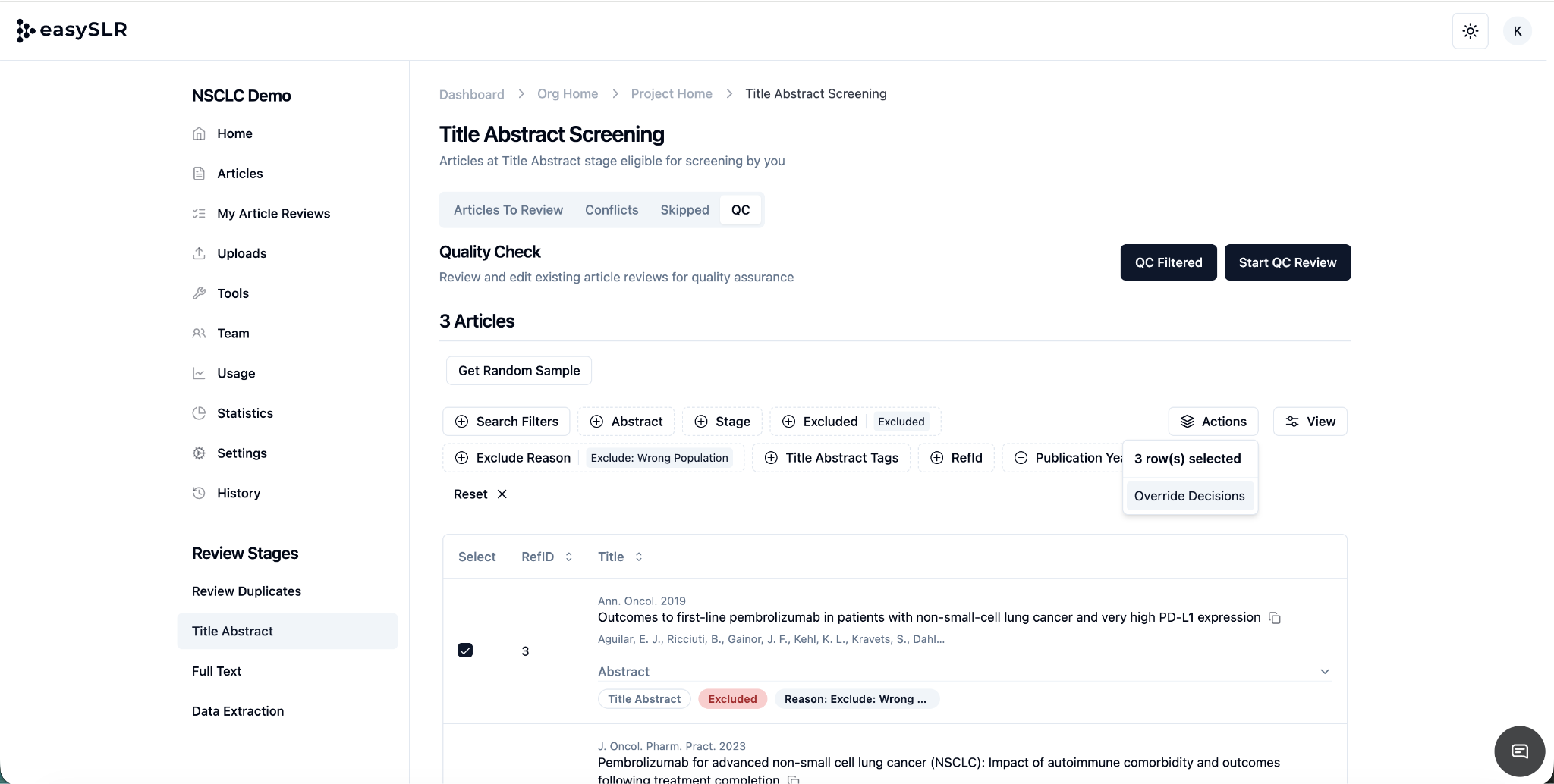 In EasySLR, Quality Check (QC)— allows Project Owners to review and revise final inclusion/exclusion decisions made during the screening process (Title-Abstract or Full-Text stage).