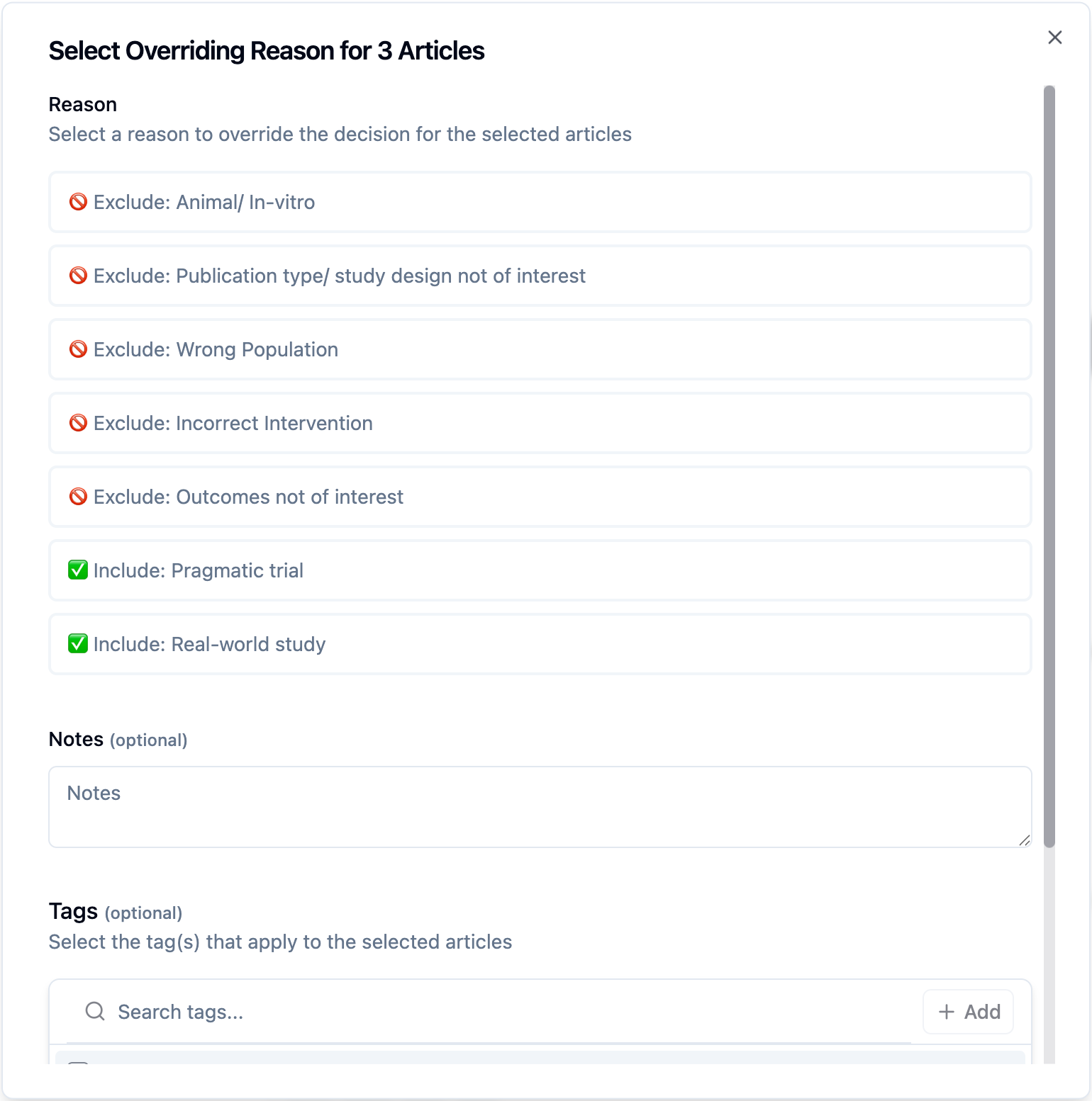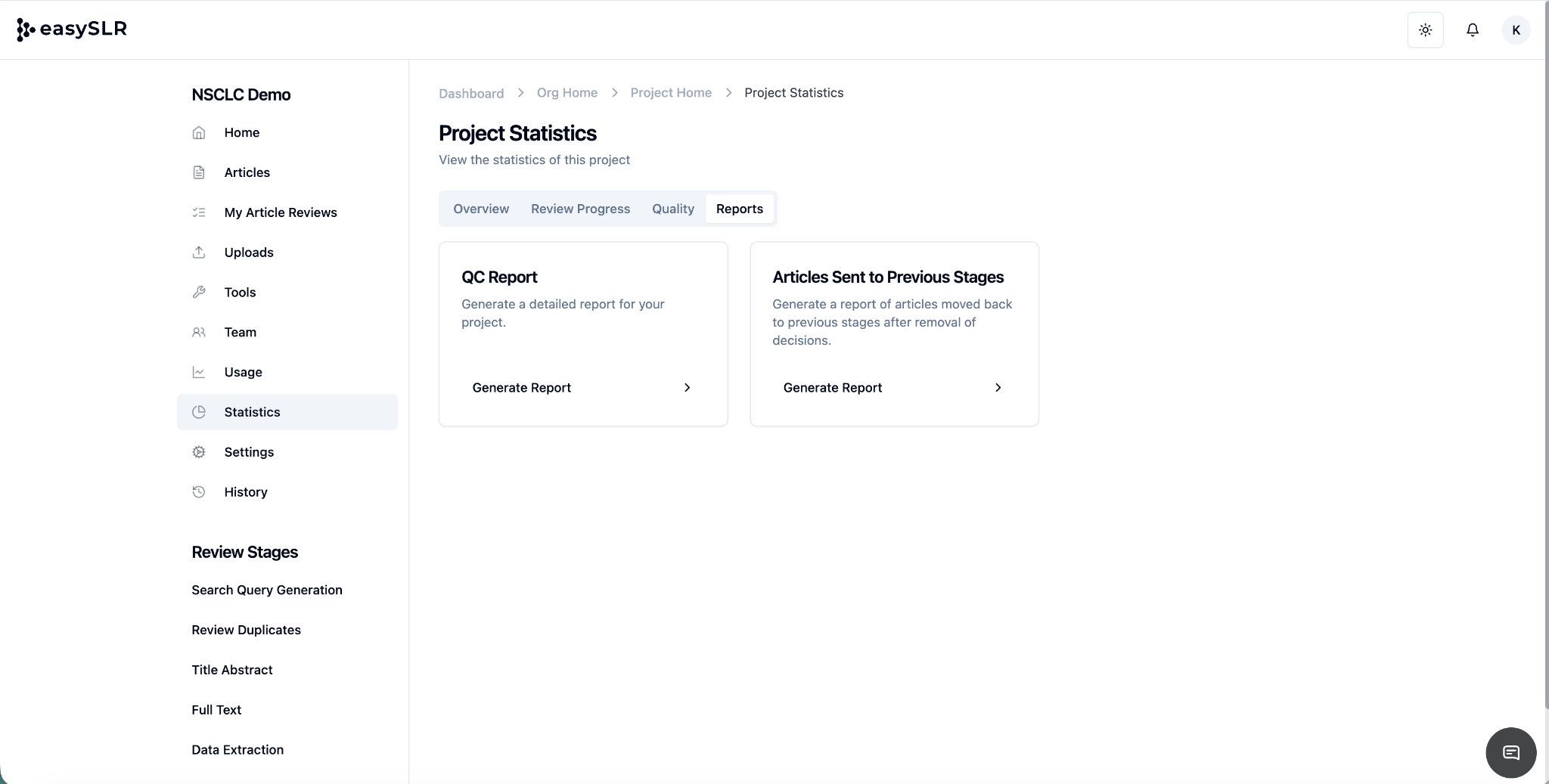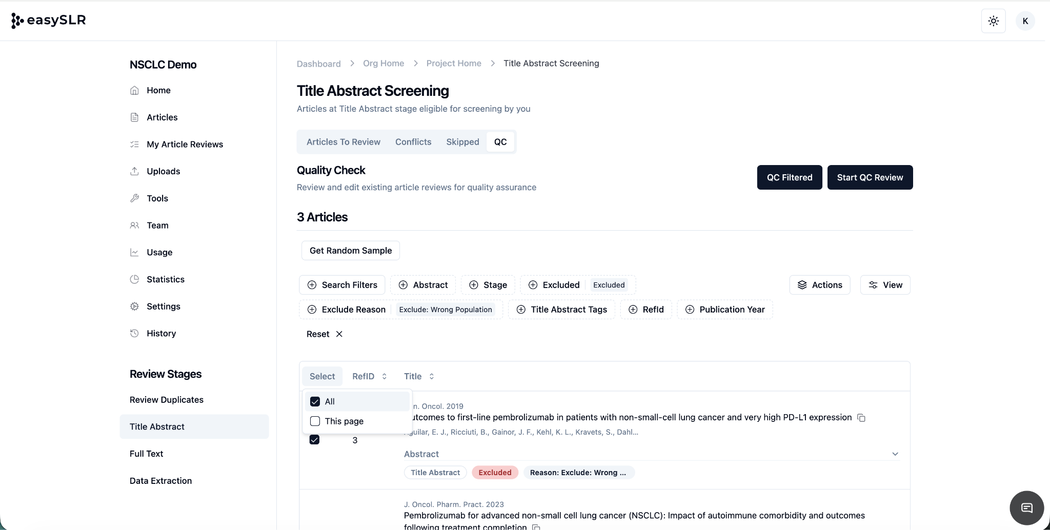 In EasySLR, Quality Check (QC)— allows Project Owners to review and revise final inclusion/exclusion decisions made during the screening process (Title-Abstract or Full-Text stage).