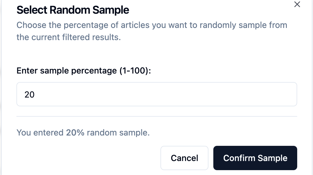 Random Sampling allows you to quickly pull a representative subset of articles from your QC pool without manually applying multiple filters. This makes quality control faster and more efficient while maintaining transparency.