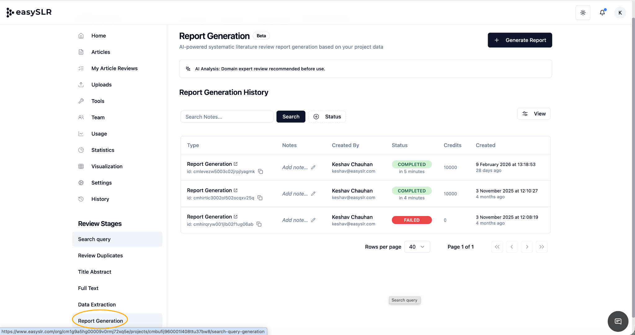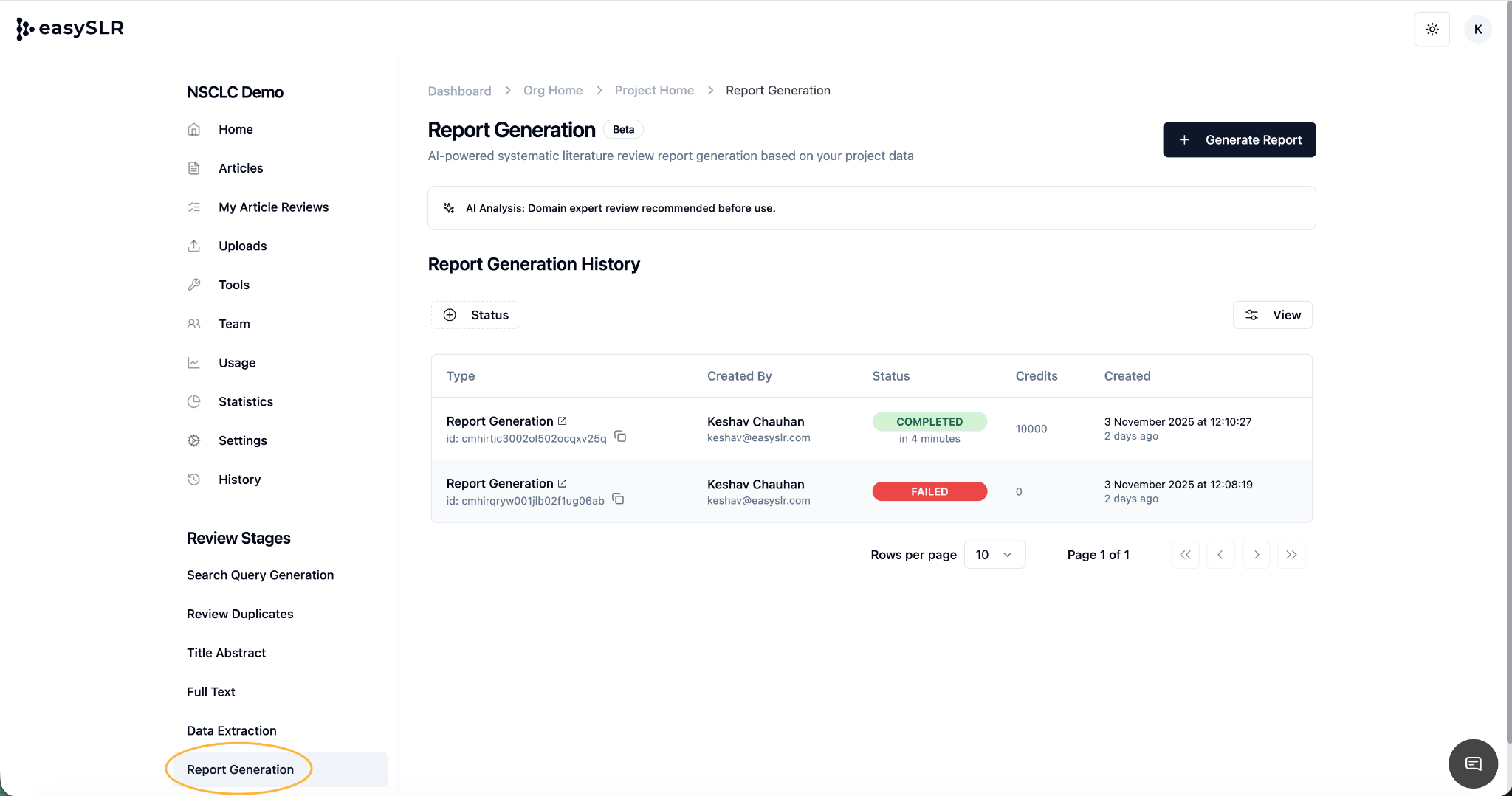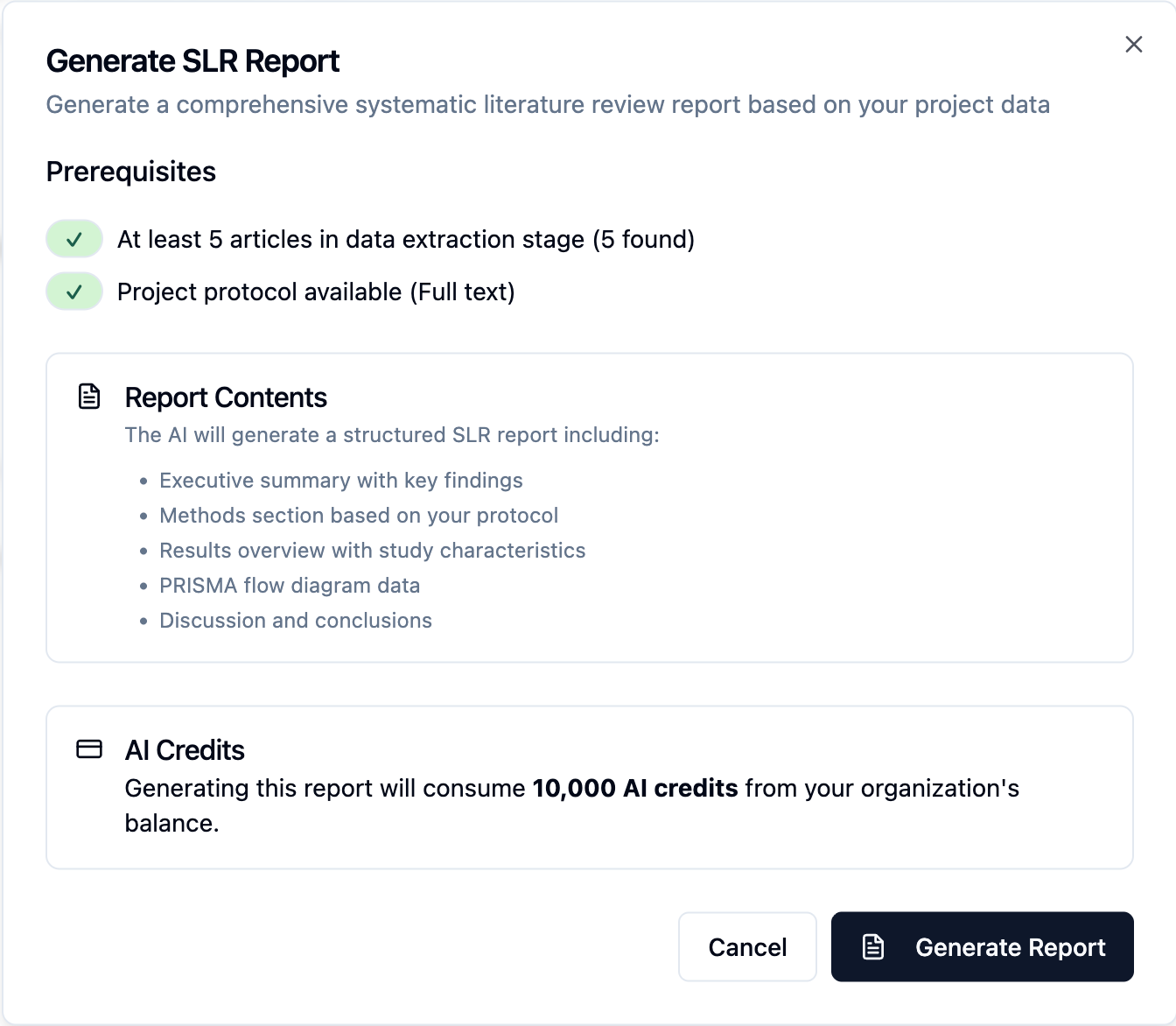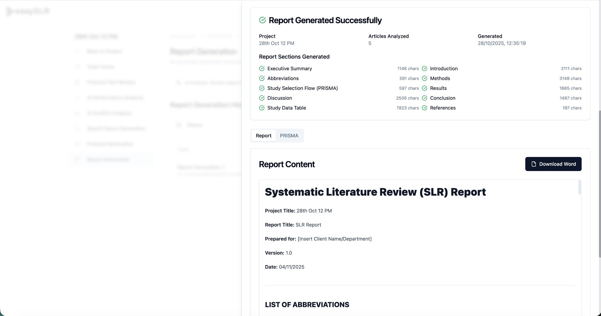The Report Generation feature in EasySLR helps you automatically generate structured, publication-ready reports based on your project data. It consolidates extracted data, screening outcomes, PRISMA flow, and key study summaries into a single, editable report — saving time and ensuring consistency across reviews.