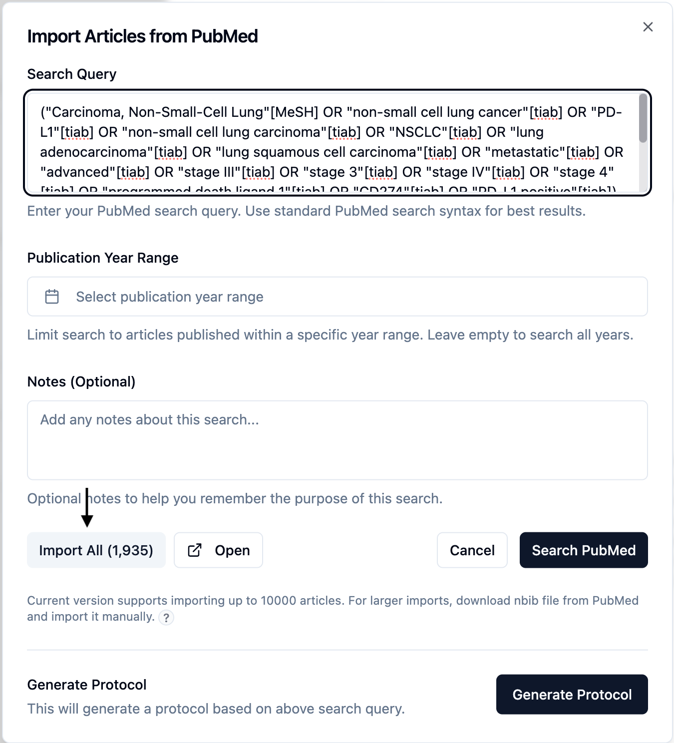 Note: If your search returns more than 10,000 articles, we recommend downloading the NBIB file from PubMed and uploading it to EasySLR as Pubmed does not allow importing more than 10,000 articles at a time. For step-by-step instructions refer to the help article here: How to export NBIB File from PubMed?