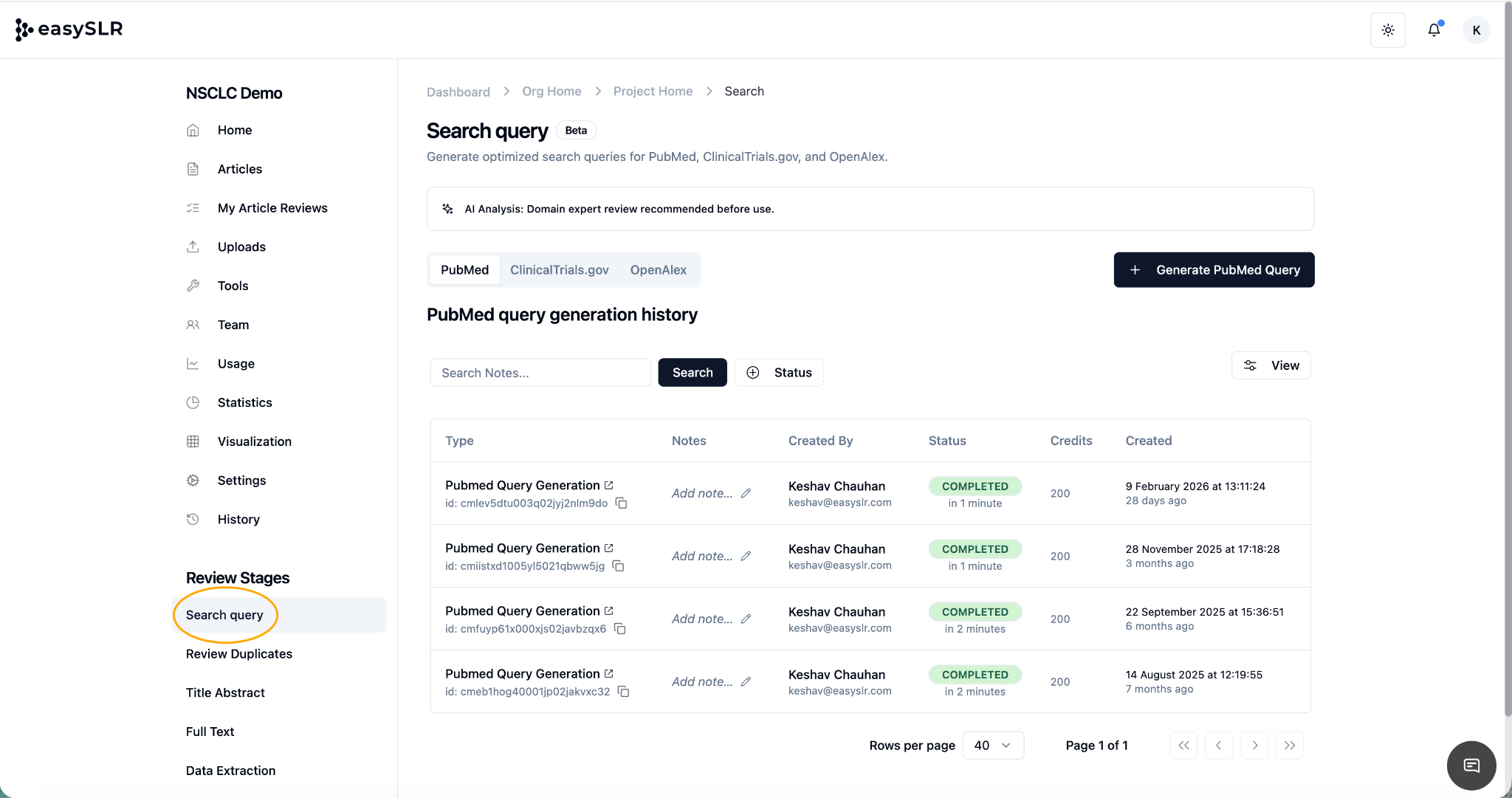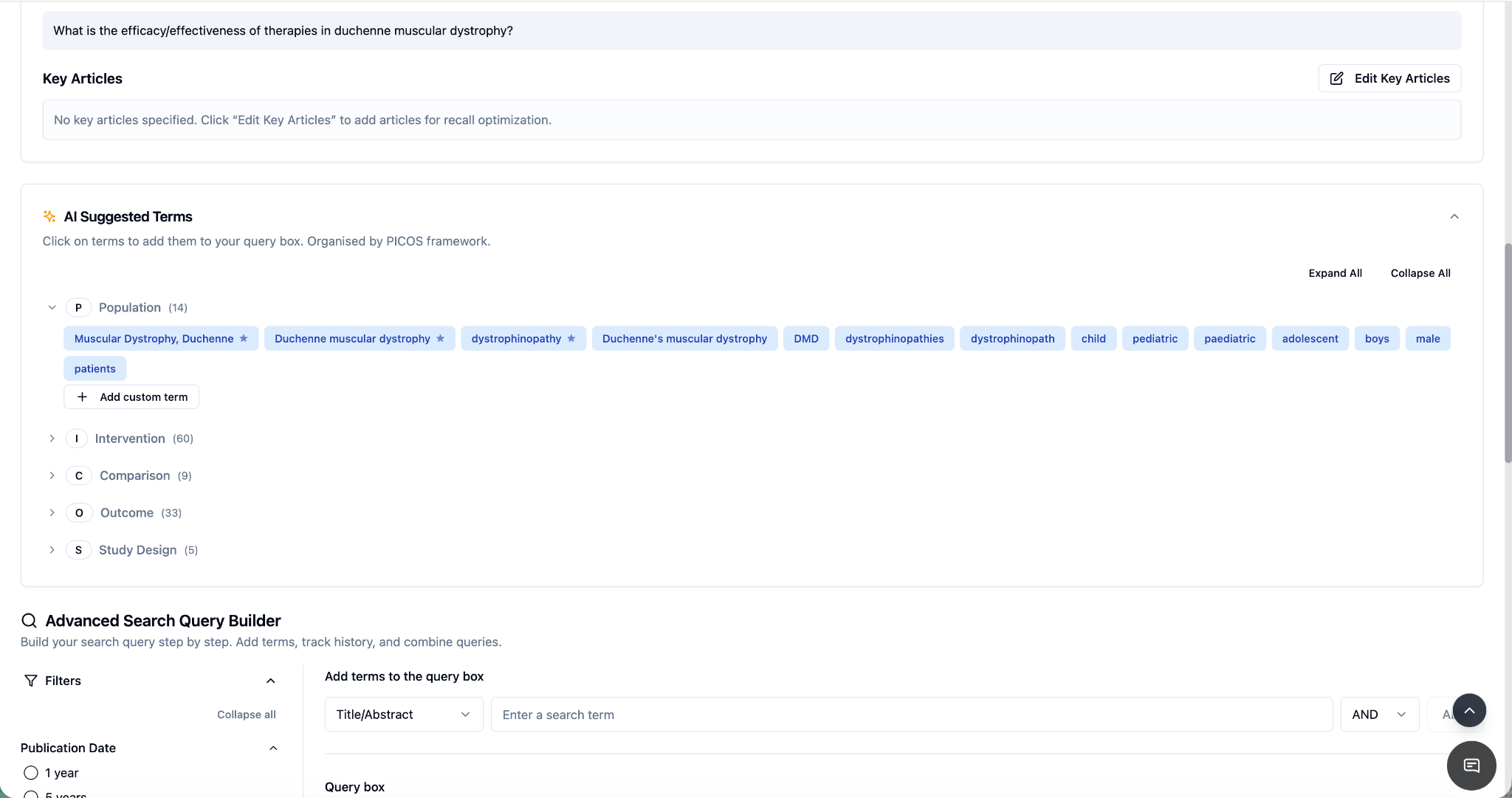 The Advanced Query Builder ensures your PubMed search development remains structured, traceable, and methodologically rigorous within EasySLR.