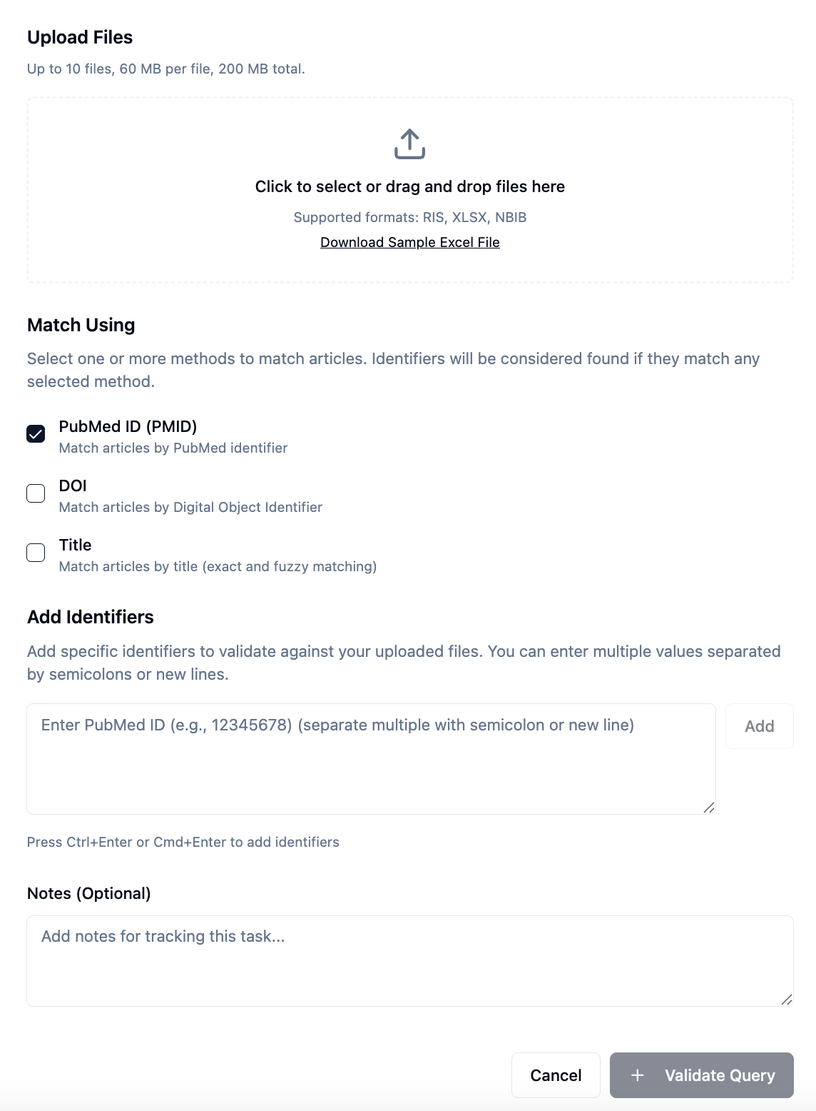 By validating your query against selected identifiers (PMID, DOI, or Title), the tool measures recall, identifies gaps, and ensures your search strategy is aligned with your research objective.