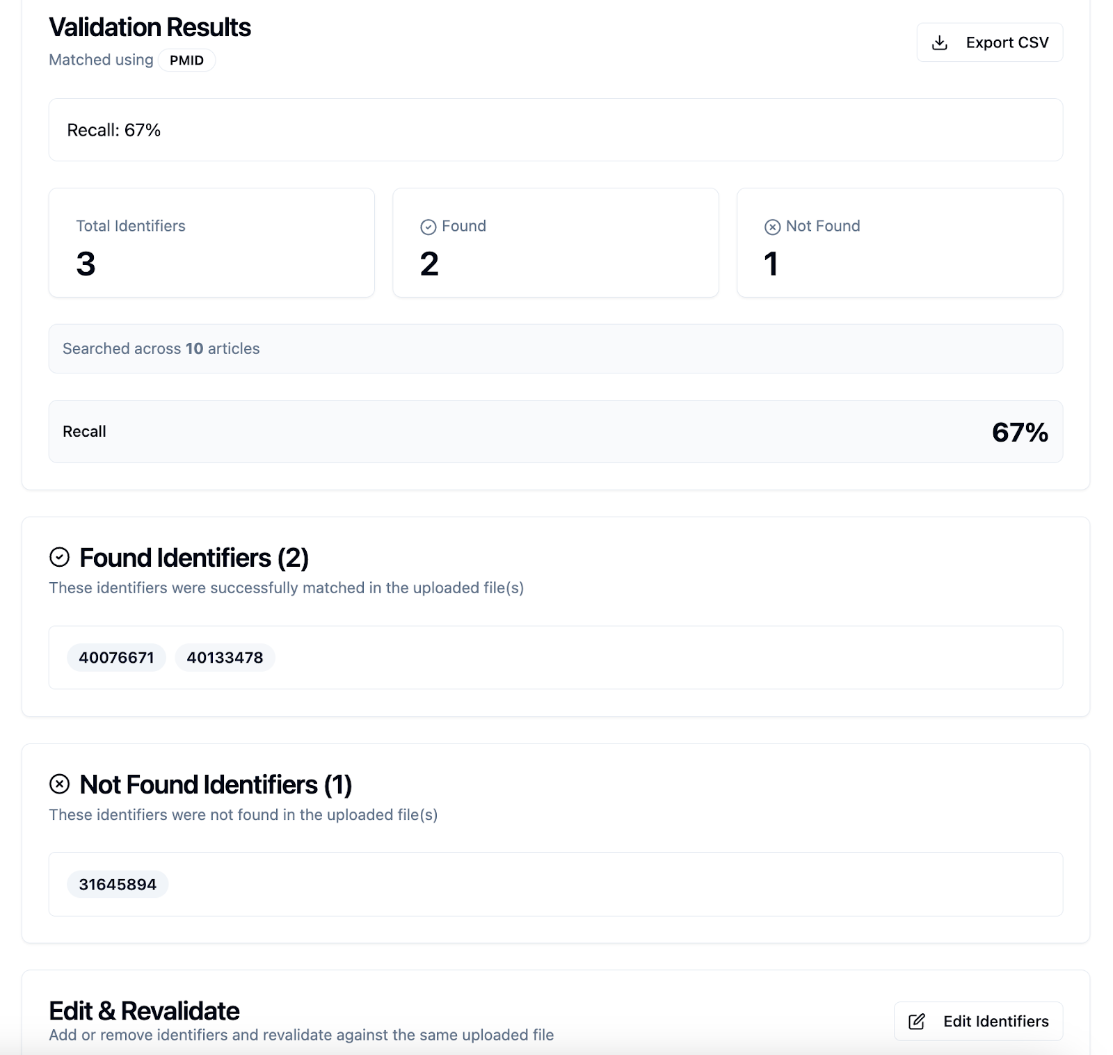 This feature works through structured identifier matching (PMID, DOI, Title) and recall calculation, and does not use AI-generated outputs.