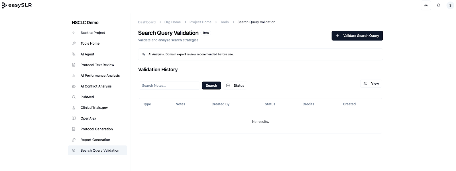 The Search Query Validation Tool in EasySLR helps you test whether your search strategy successfully retrieves key known studies before starting screening.