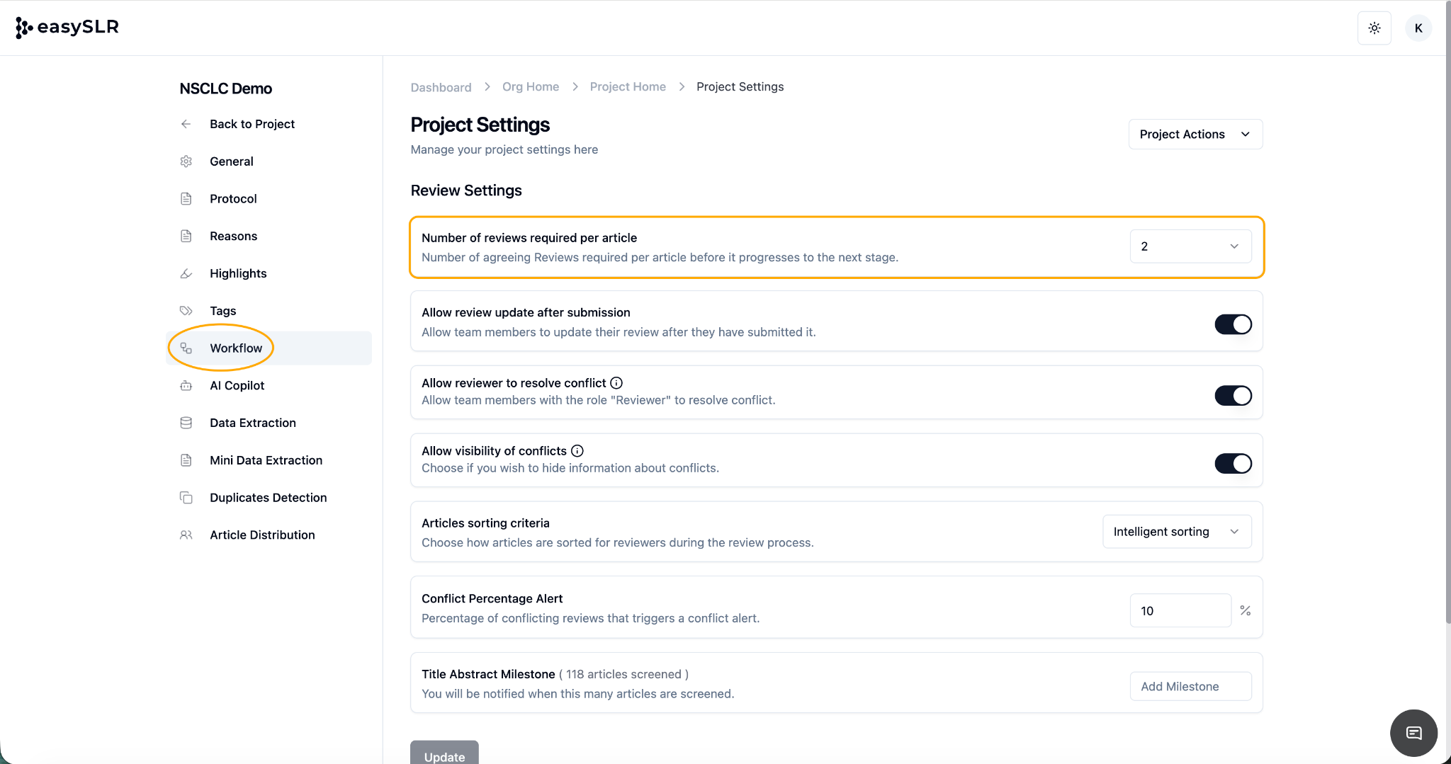 Navigate to the “Workflow” section and set the number of reviews required per article to “2”.