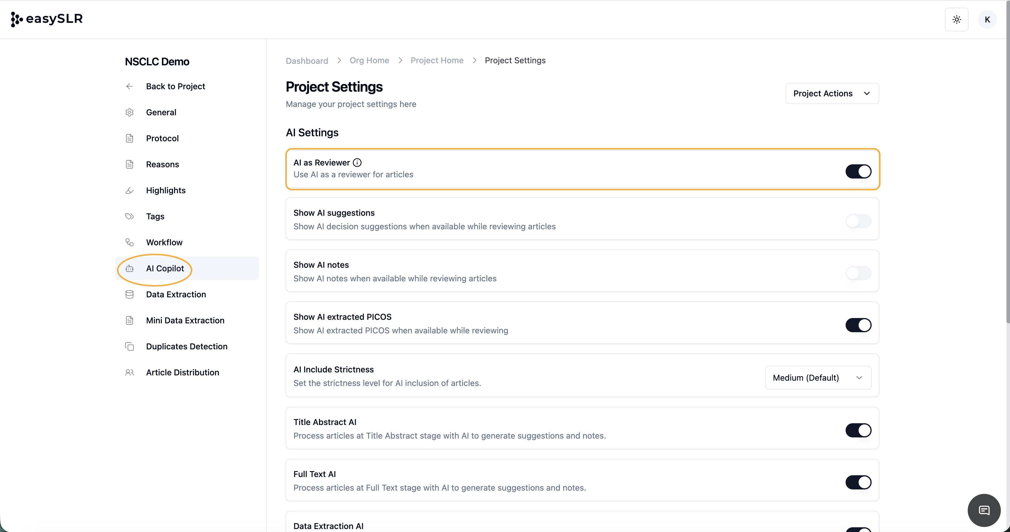 Head to the AI Copilot section and enable AI as a Reviewer. Note that enabling AI as a reviewer will automatically disable AI suggestions and notes to ensure no bias in human reviews.