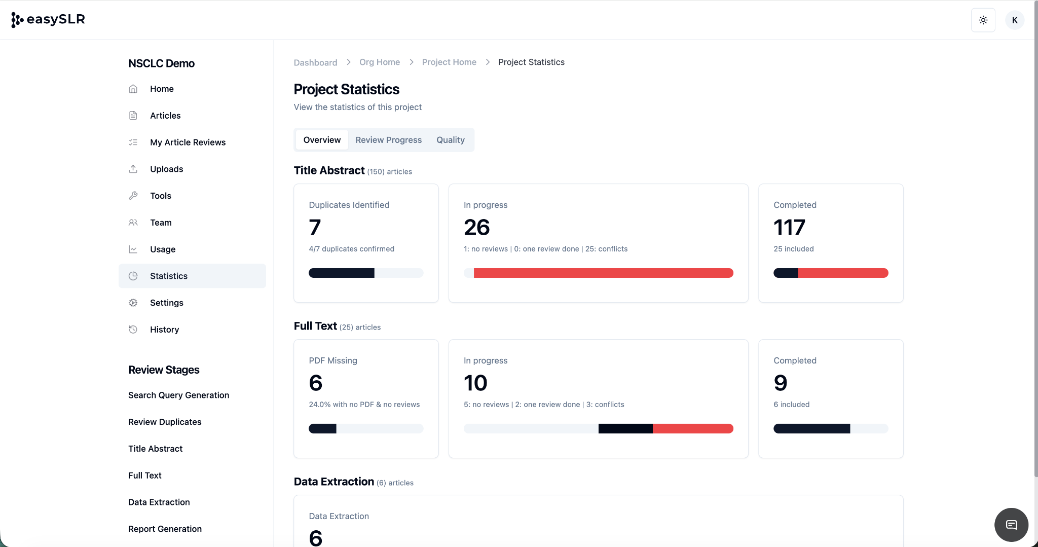 To understand the Project Statistics, navigate to the Statistics section located in the left sidebar. The progress of the screening at each stage is clearly shown here along with the breakdown for easy understanding.