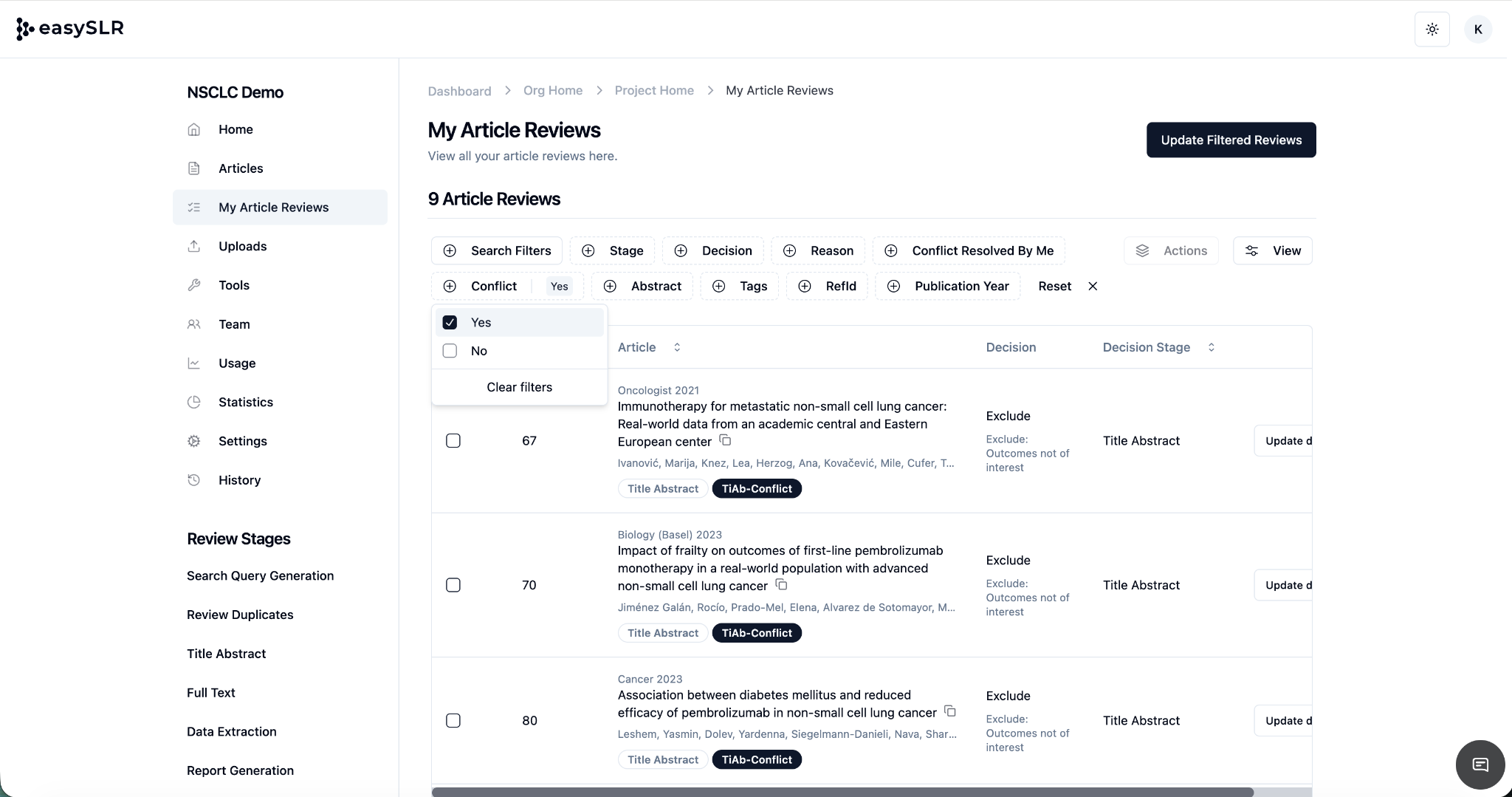 In some workflows, teams prefer to resolve disagreements between reviewers directly before involving a Lead Reviewer. The Conflict Filter makes it easy to: