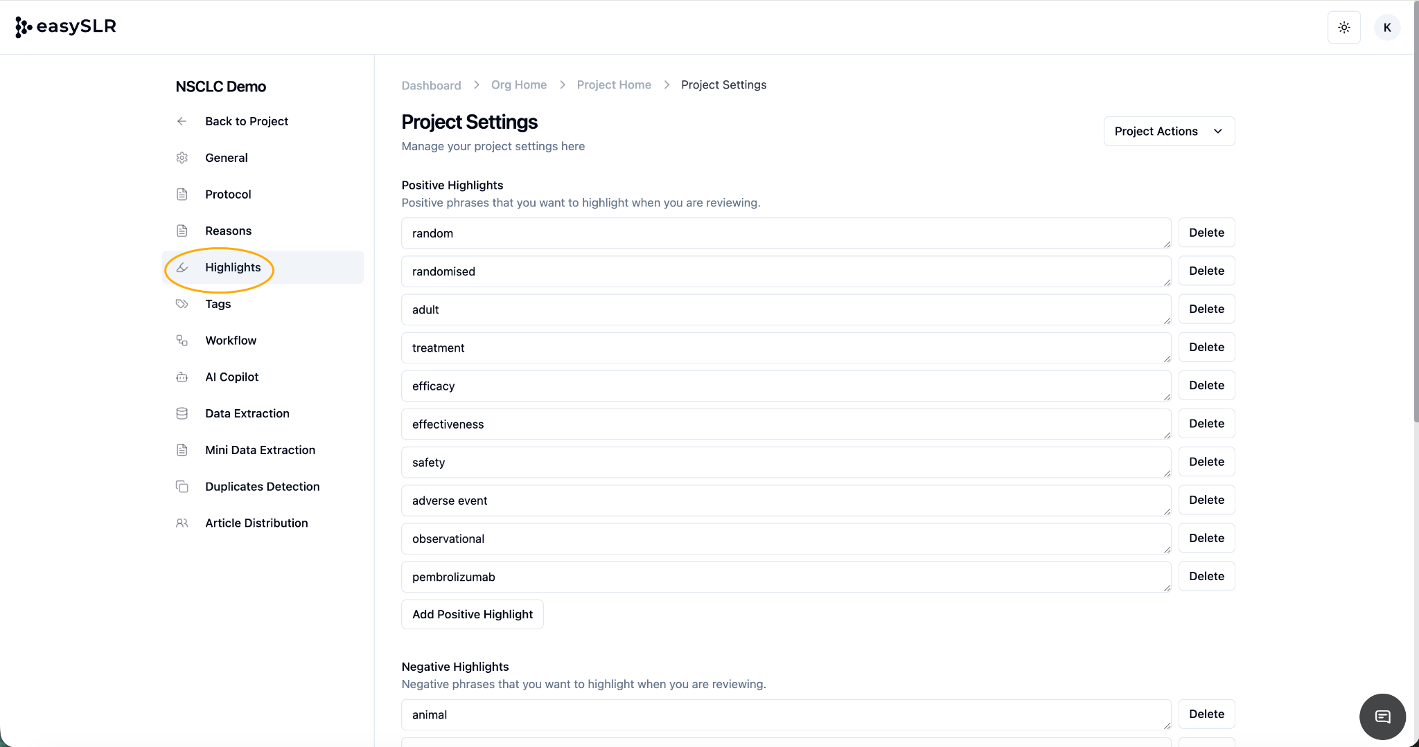 Highlights are provided to help you make better and faster decisions during the screening process. You can choose certain words to be highlighted in the articles as either Green (Positive Highlight) or Red (Negative Highlight), which will help you make informed decisions.