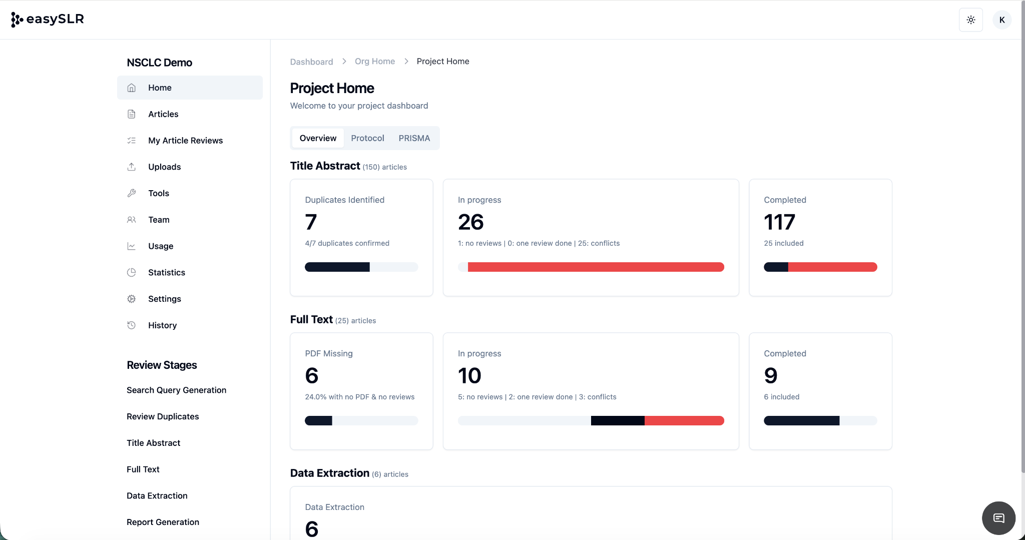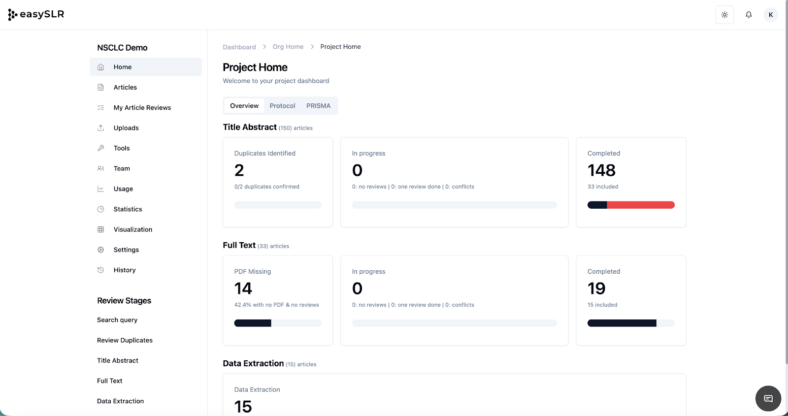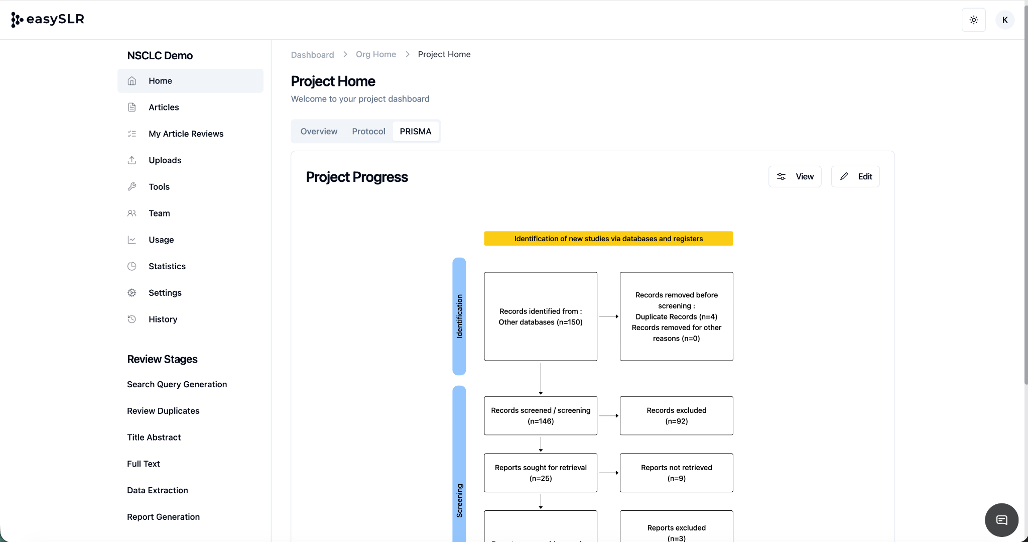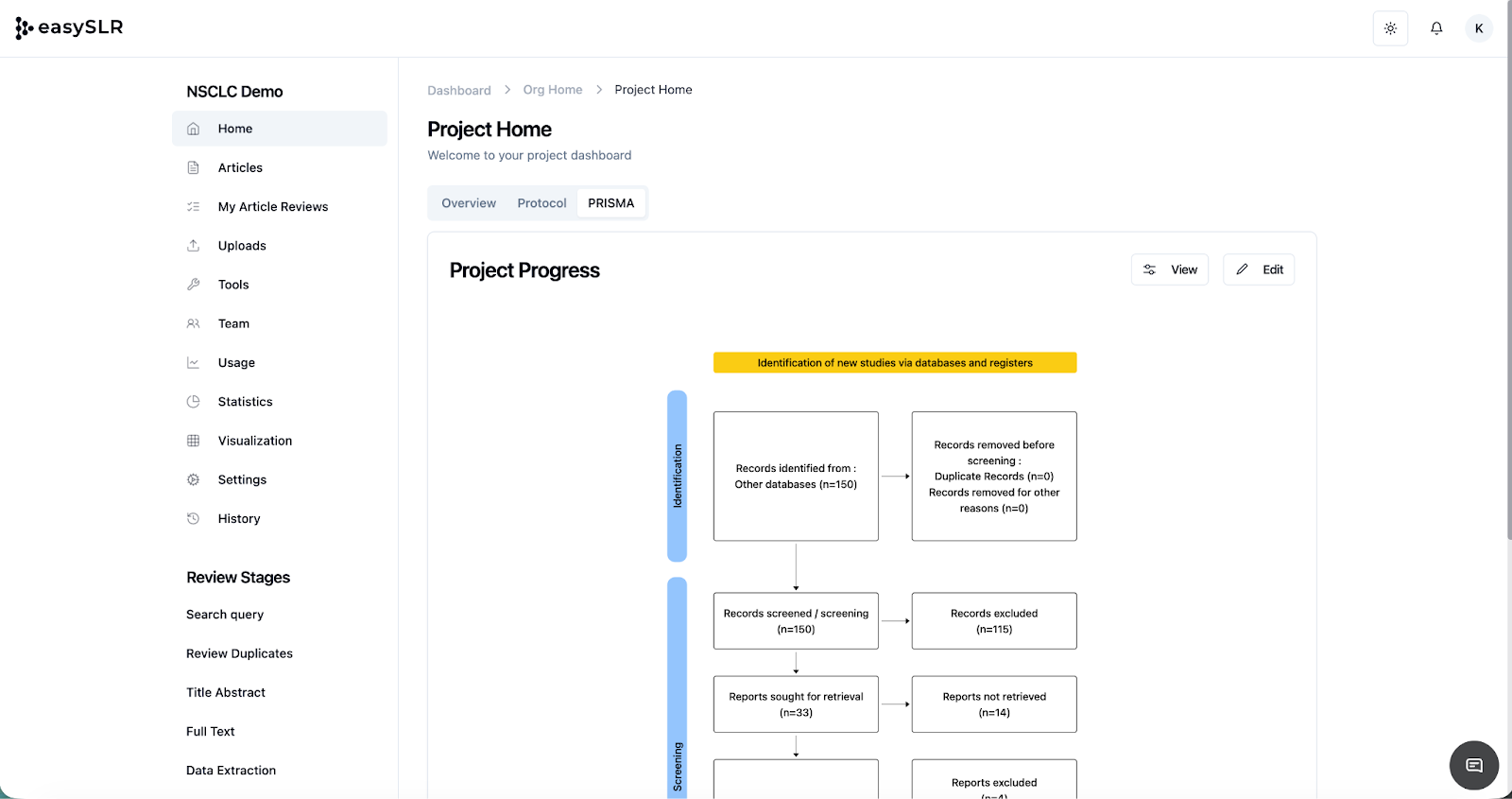 Click on "Project Home" at the top for a comprehensive overview of the project’s progress. Additionally, you can view and download the "PRISMA".